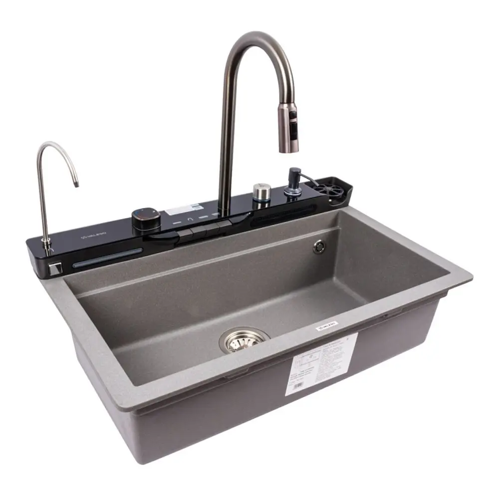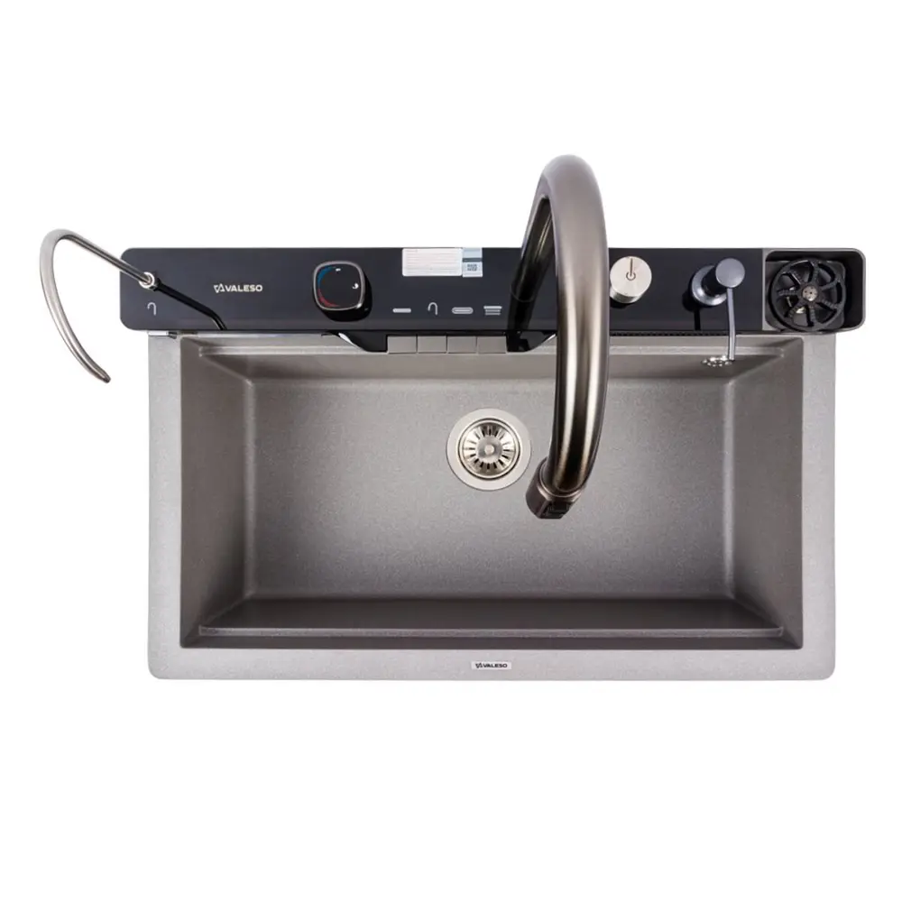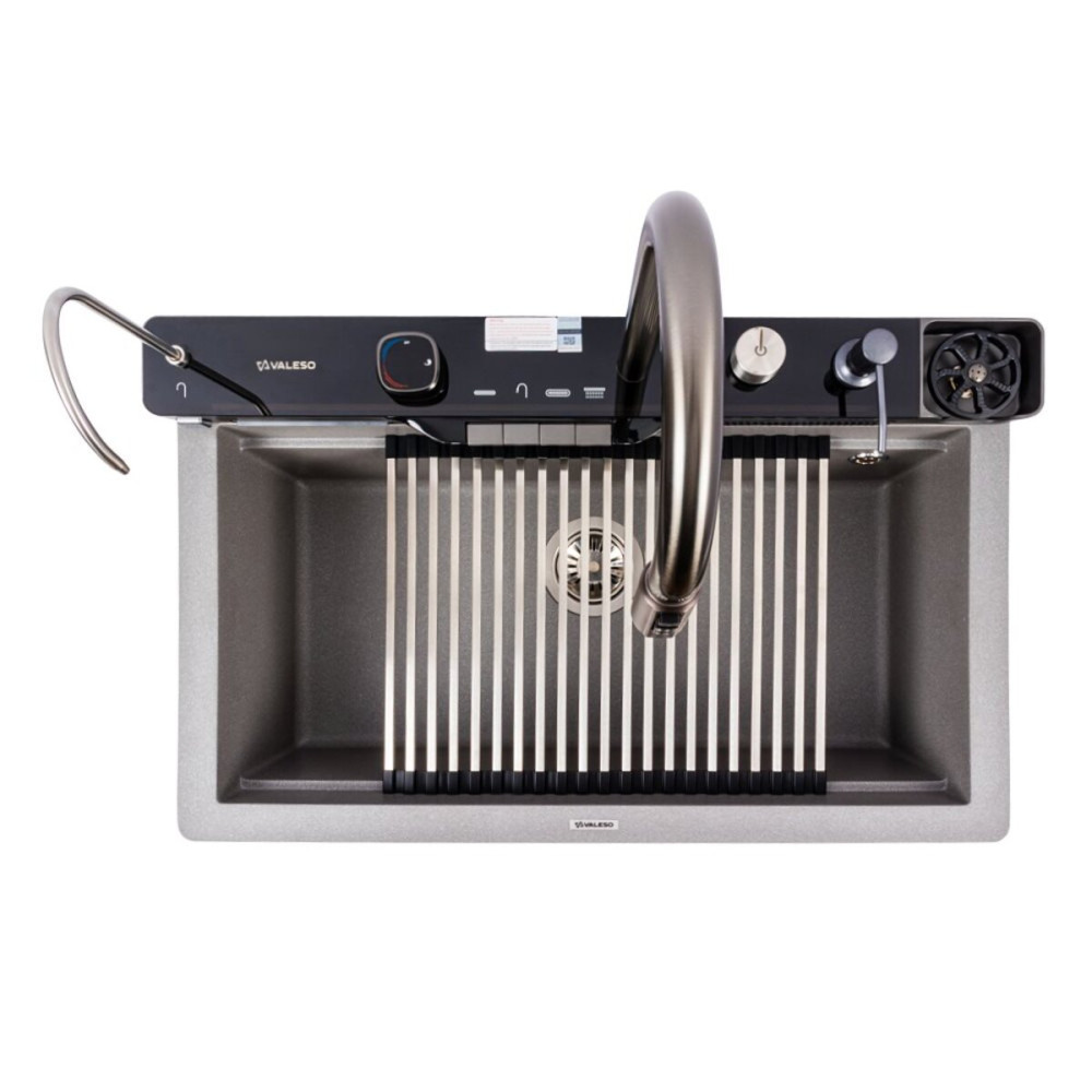 Гранітна мийка VALESO 7546 EVANORA у кольорі сірий мусон — це не просто мийка, а повноцінна інтегрована кухонна робоча станція, що втілює розкіш, інновації та функціональність. Її матова поверхня та глибокий сірий відтінок з легкими вкрапленнями підкреслюють сучасний, преміальний дизайн.