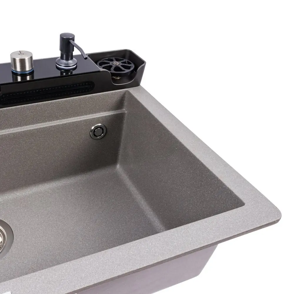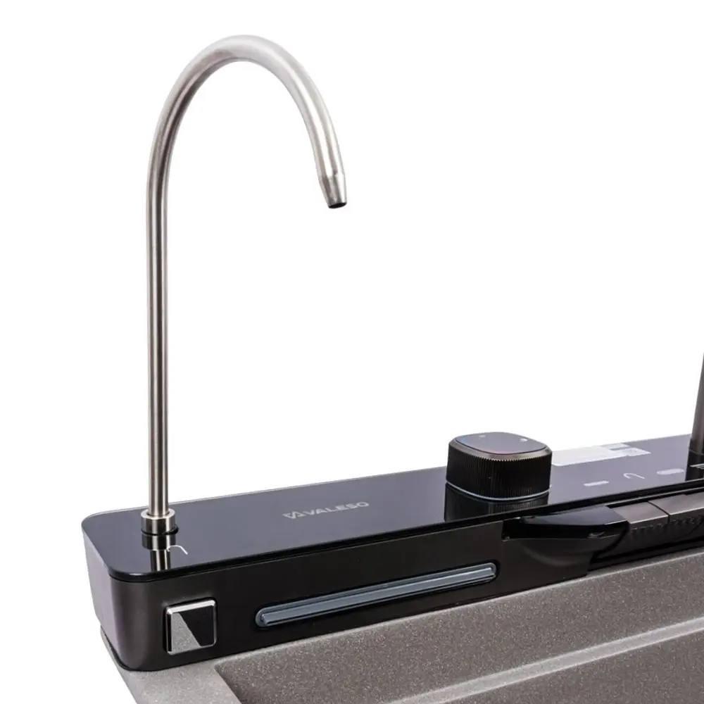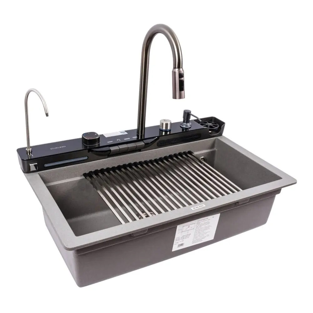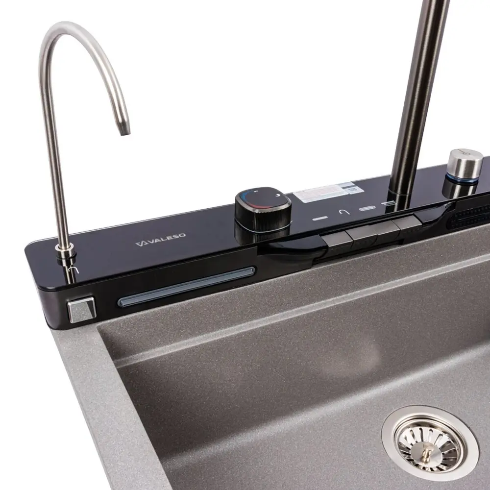 Гранітна мийка VALESO 7546 EVANORA у кольорі сірий мусон — це не просто мийка, а повноцінна інтегрована кухонна робоча станція, що втілює розкіш, інновації та функціональність. Її матова поверхня та глибокий сірий відтінок з легкими вкрапленнями підкреслюють сучасний, преміальний дизайн.