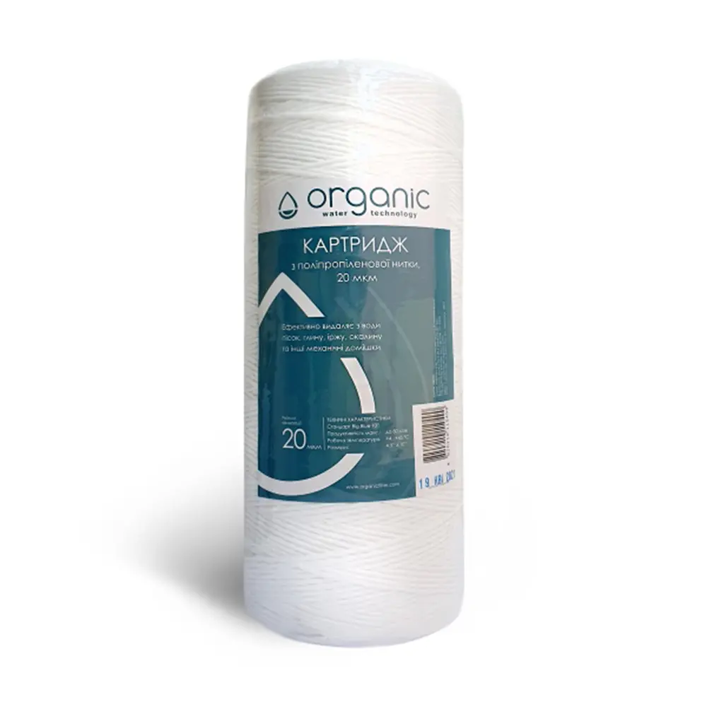 Картридж із поліпропіленової нитки Organic DMSW10BB20 - використовується для очищення води від завислих частинок діаметром до 10 мкм у магістральних фільтрах, які встановлюються на вході у квартиру чи будинок. Даний механічний картридж має щільну структуру намотування поліпропіленового шнура, що дозволяє ефективно затримувати всі механічні домішки, що містяться у водопровідній воді. Термін служби 4 – 6 місяців.
