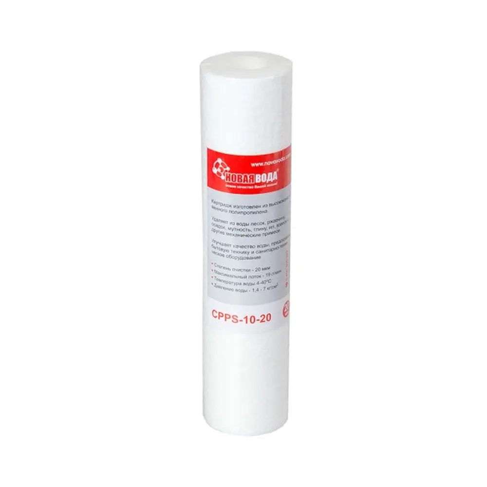 Картридж поліпропіленовий Нова Вода CPPS-10-20 mcr змінний фільтруючий елемент, застосовується в системах зворотного осмосу та проточних фільтрах. Сприяє очищенню води від піску, іржі, глини та різних механічних забруднень. Не збагачує воду додатковим смаком або запахом. Використовується як третій попередній фільтр у системах зворотного осмосу Нова Вода та інших, що відповідають типорозмірам.