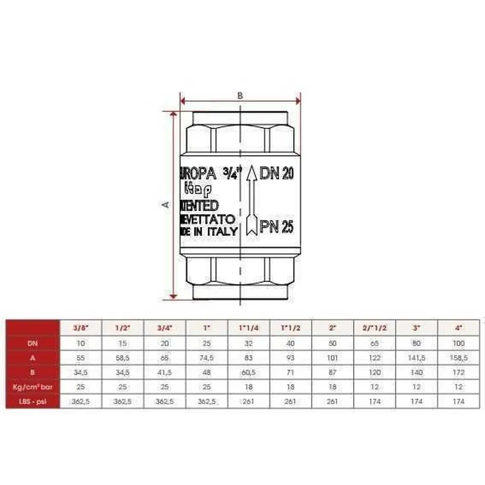 Технічні характеристики Клапан зворотного ходу води ITAP (100) 1/2 "EUROPA з латунним штоком: