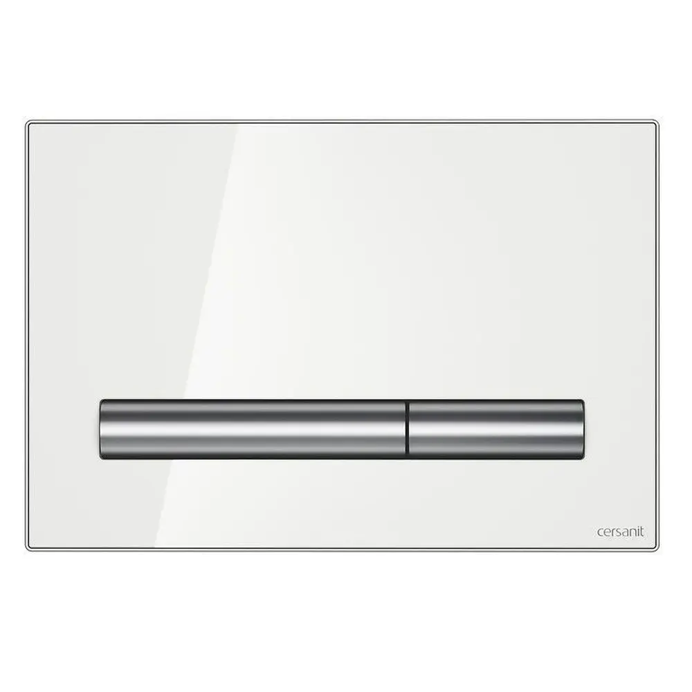 Кнопка PILOT виготовлена з білого скла та обрамлена тонкою хромованою рамкою з блискучим оздобленням. Напівкруглі клавіши відносяться до круглих форм кераміки. Проста, економічна форма підійде до різних стилістичних інтерєрів.