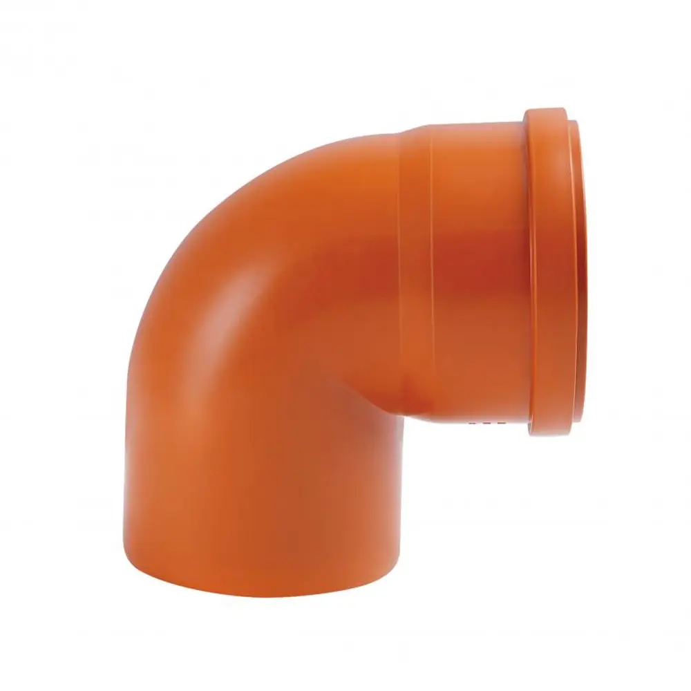 Коліно ПВХ каналізаційне TA Sewage 110, 90° призначене для виконання повороту в трубопроводах зовнішньої каналізації. Матеріал виготовлення — НПВХ (полівінілхлорид непластифікований), колір виробу — оранжево-коричневий. Метод монтажу — з‘єднання в розтруб. Кутовий каналізаційний фітинг відрізняється довговічністю, легкою вагою, не піддається процесам корозії. Сфера застосування — інженерні мережі стічних вод, що прокладаються поза будівлями.