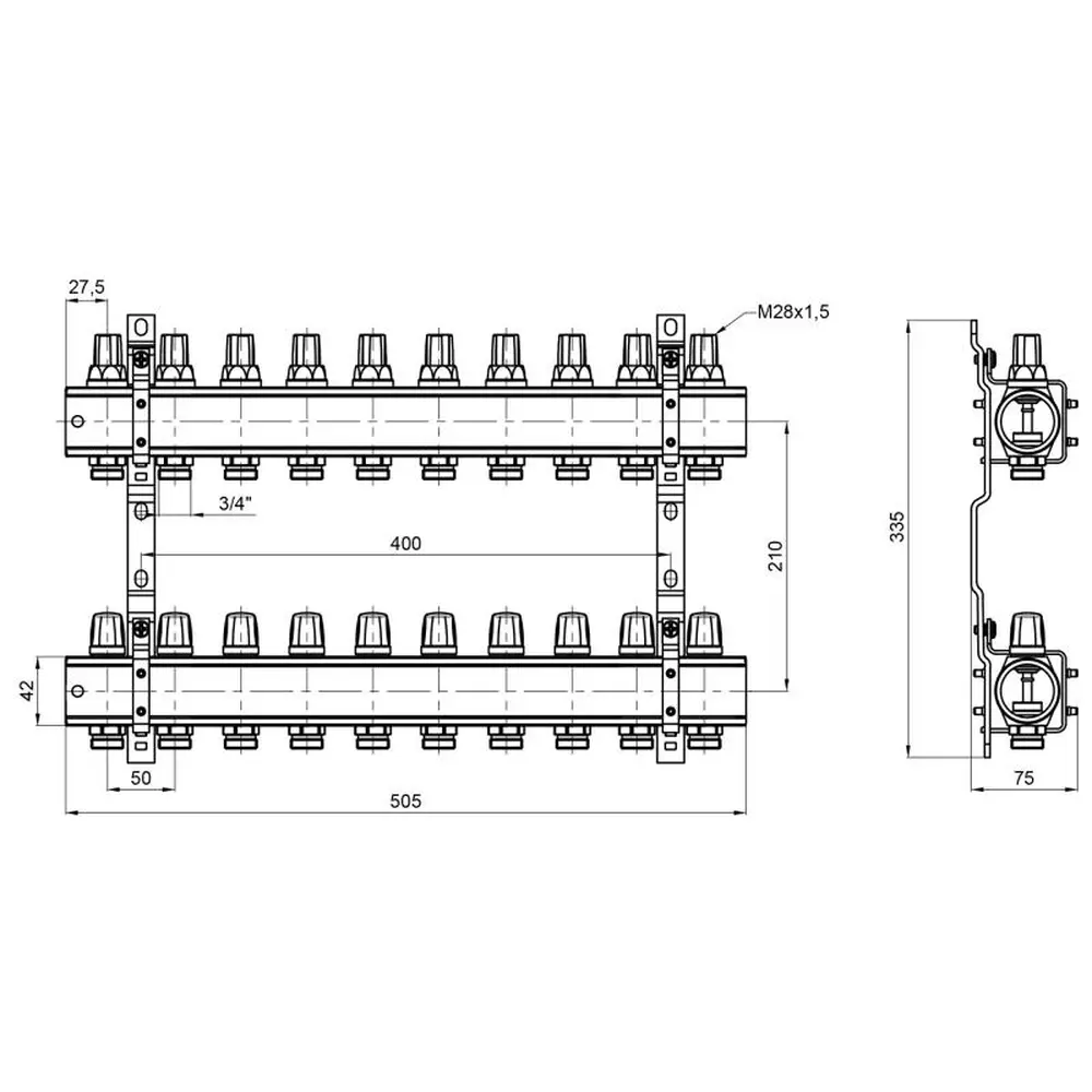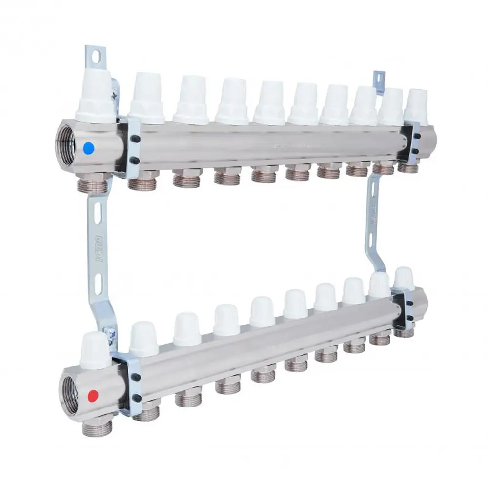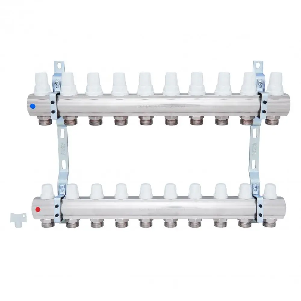 Колектор ICMA Арт. K005 з запірними кранами з мікрометричним регулюванням призначений для розподілу теплової енергії в системі опалення. Дана установка застосовується в системах радіаторного опалення. Регулювання витрати мережної води по контурах - ручна або терморегулююча. Запірні крани з мікрометричним регулюванням дозволяють перекривати подачу води і регулювати витрату мережної води в кожному контурі опалення. Колектор має 10 виходів.