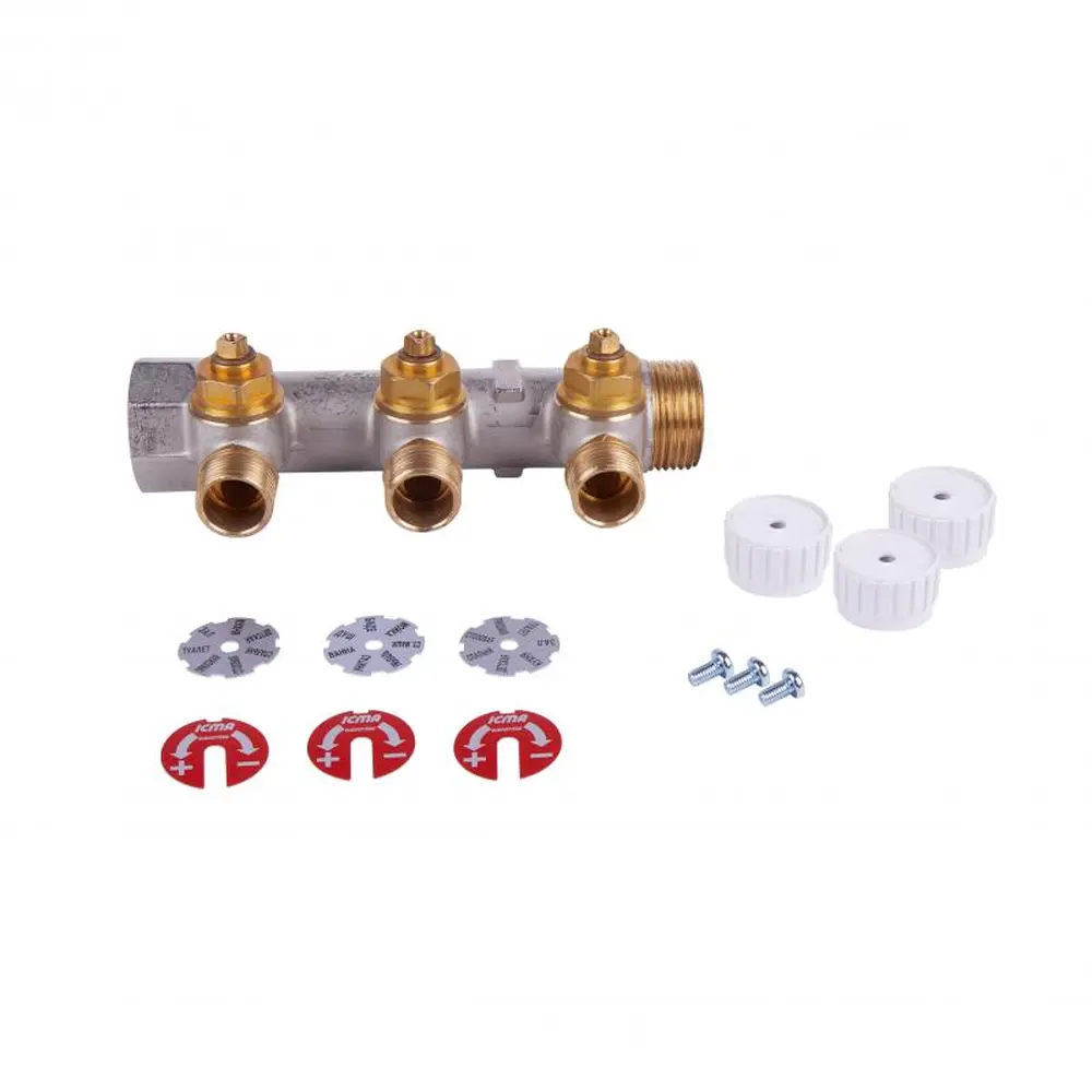 Прості збірні колектори ICMA Арт. 227 застосовуються в системах водопостачання і кондиціонування. Бічні виходи колектора дозволяють підключати мідну, пластикову і металопластикову труби. Колектор оснащений перекриваючими кранами з подвійною кільцевою прокладкою на кожному виході колектора, що дозволяє перекрити подачу води на одній, декількох або всіх підключених до колектора лініях.