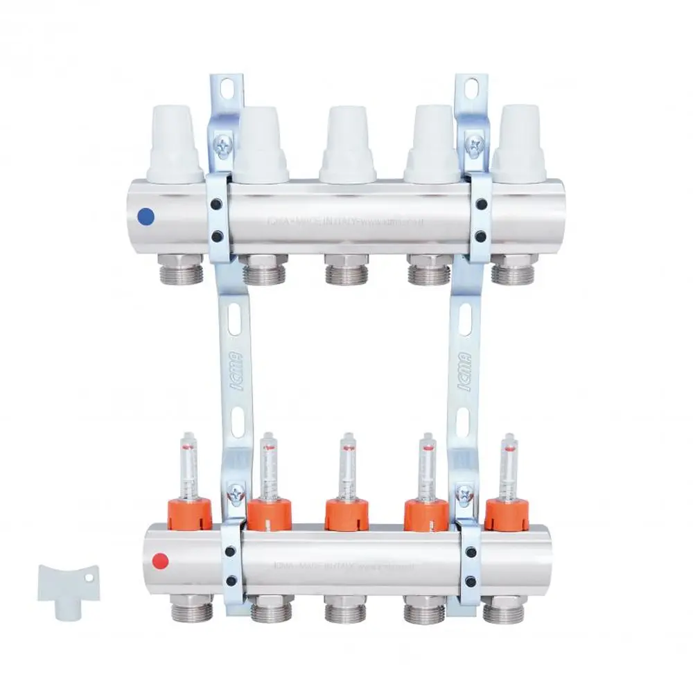 Колектор ICMA Арт. K013 призначений для розподілу теплової енергії в системі тепла підлога. Дана установка застосовується в системах опалення підлоги. Колектор дозволяє рівномірно розподіляти теплоносій. Теплоносій надходить з первинного контуру повинен бути підготовленою температури, що не перевищує 55°C. Даний колектор має 5 виходів.