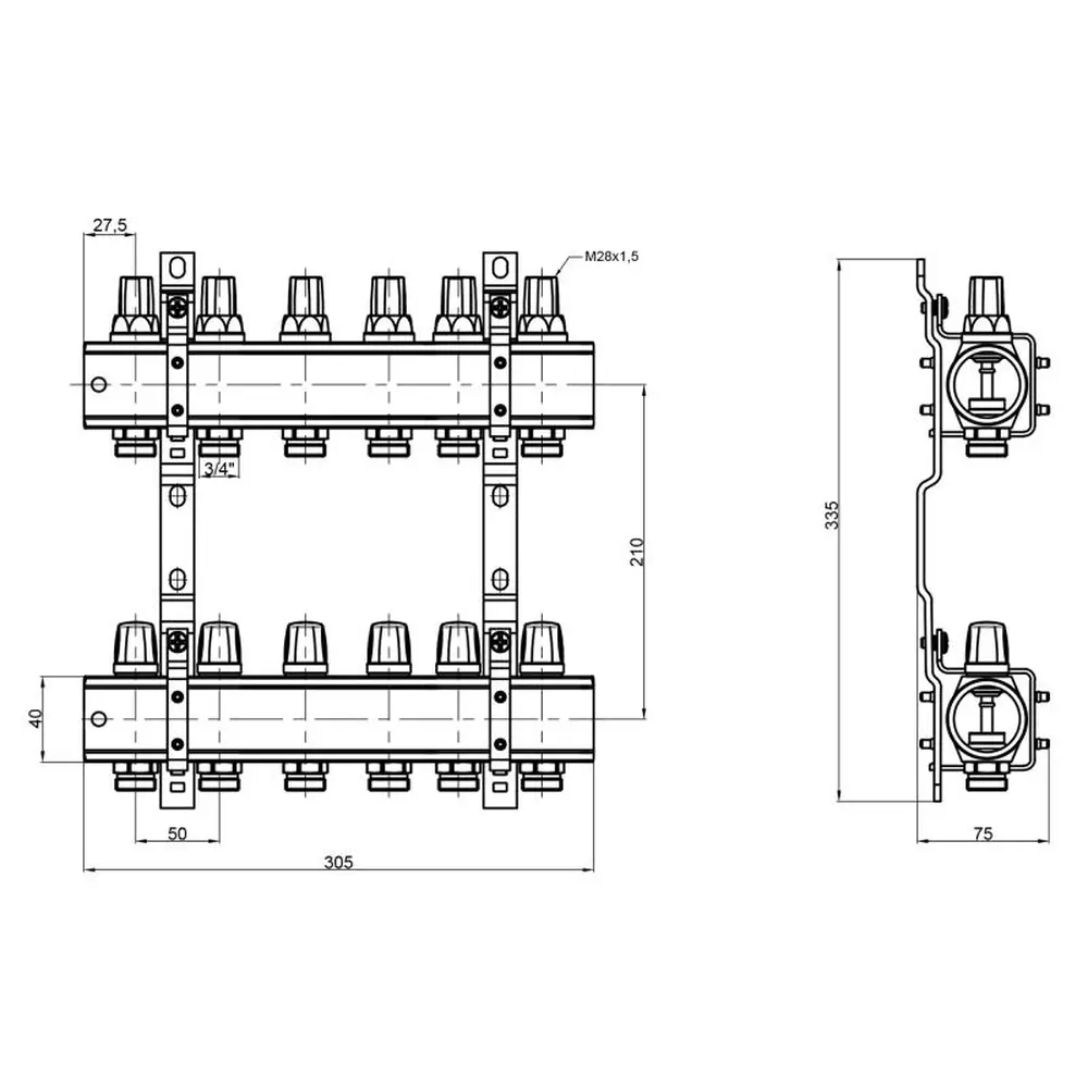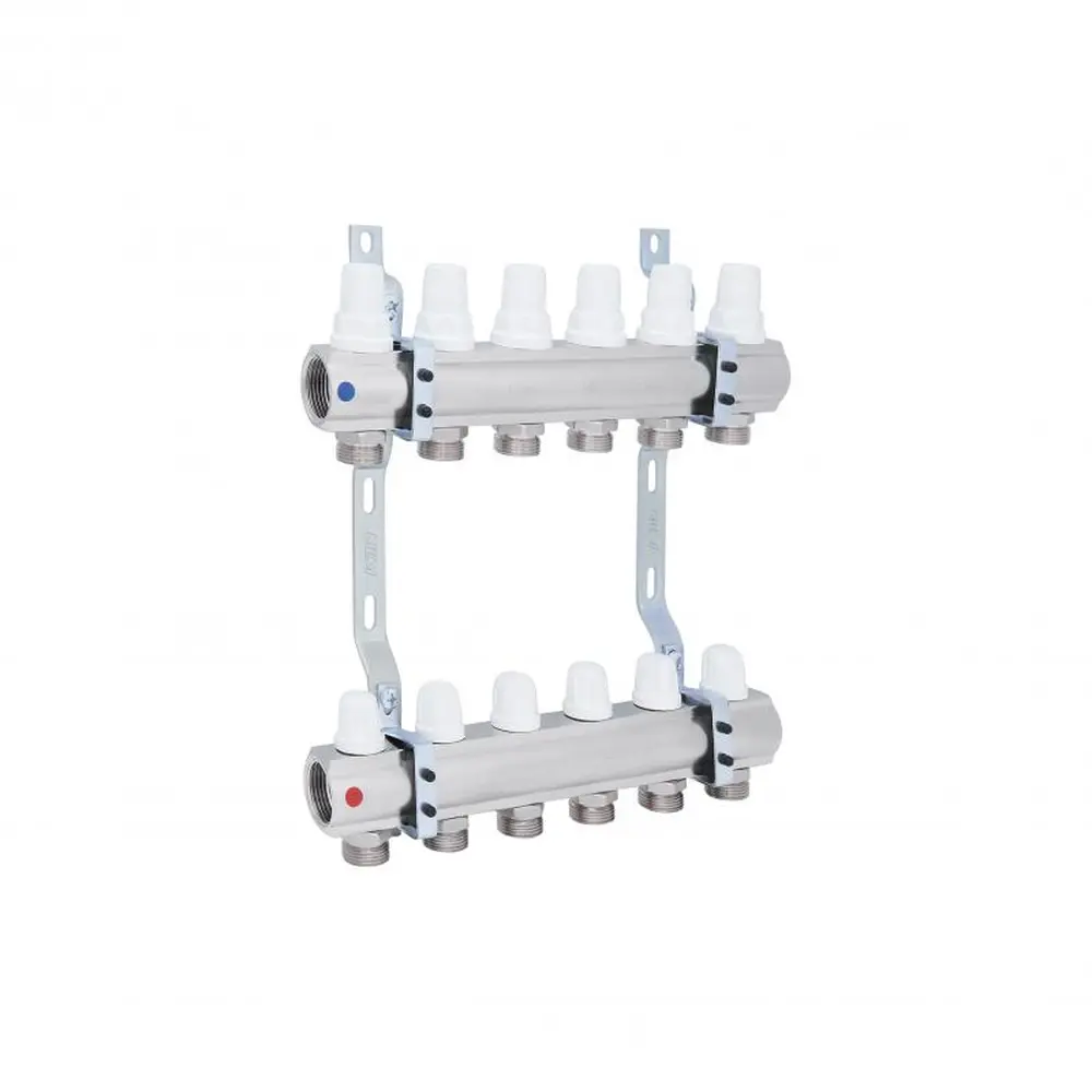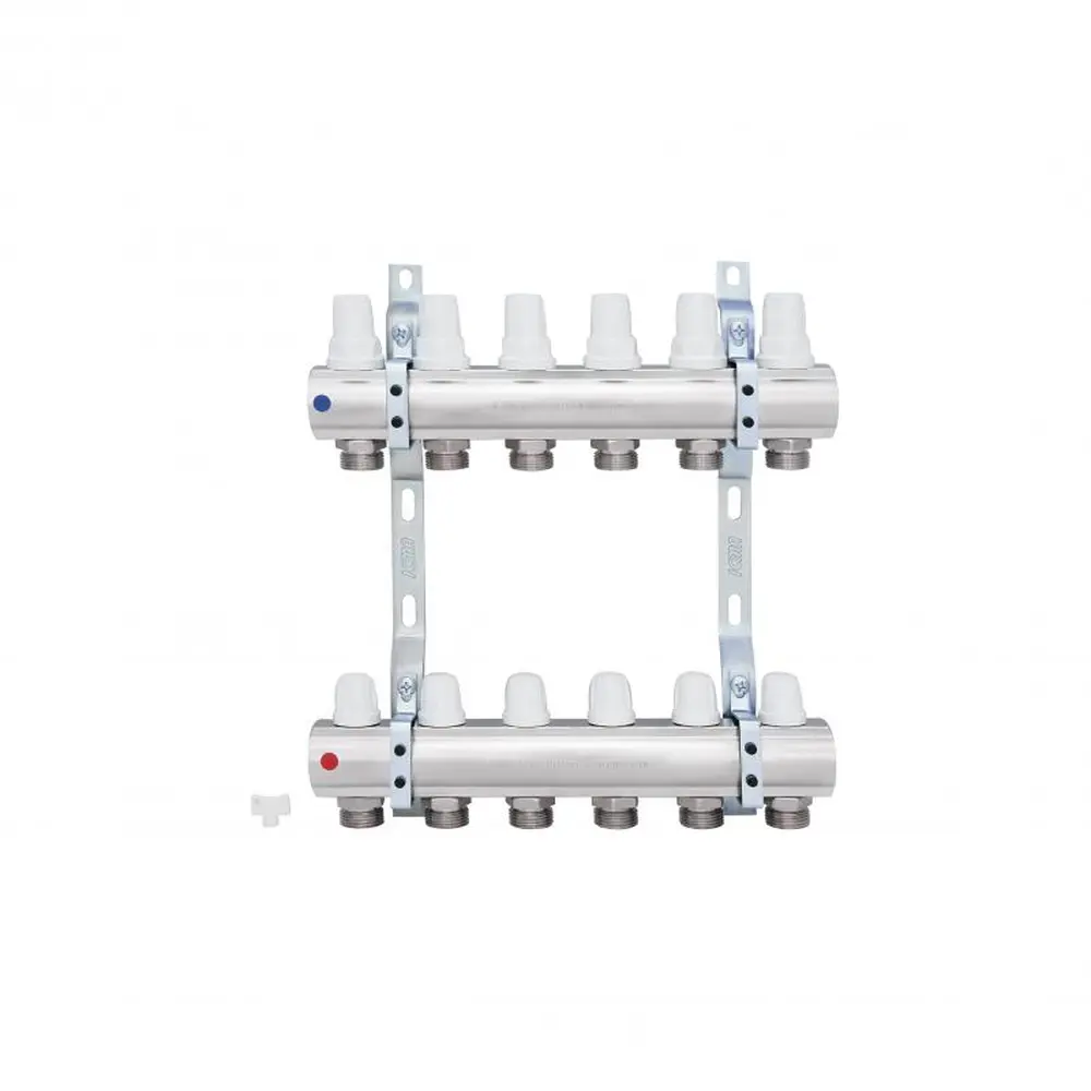 Колектор ICMA Арт. K005 з запірними кранами з мікрометричним регулюванням призначений для розподілу теплової енергії в системі опалення. Дана установка застосовується в системах радіаторного опалення. Регулювання витрати мережної води по контурах - ручна або терморегулююча. Запірні крани з мікрометричним регулюванням дозволяють перекривати подачу води і регулювати витрату мережної води в кожному контурі опалення. Колектор має 6 виходів.
