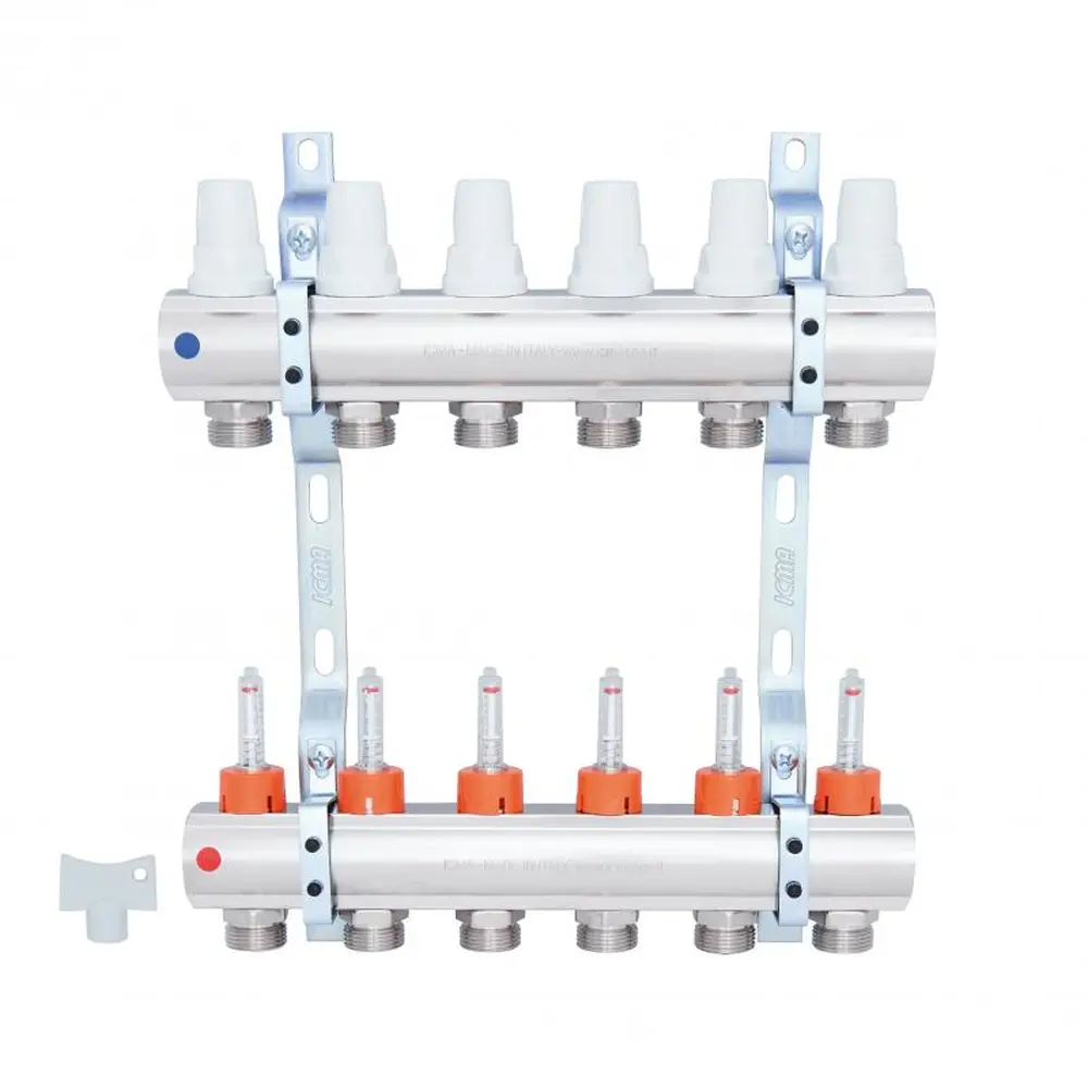 Колектор ICMA Арт. K013 призначений для розподілу теплової енергії в системі тепла підлога. Дана установка застосовується в системах опалення підлоги. Колектор дозволяє рівномірно розподіляти теплоносій. Теплоносій надходить з первинного контуру повинен бути підготовленою температури, що не перевищує 55°C. Даний колектор має 6 виходів.