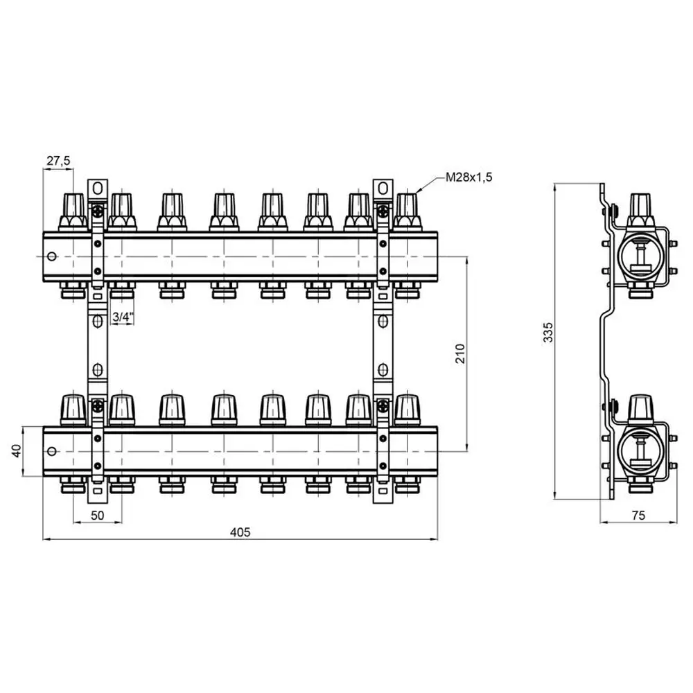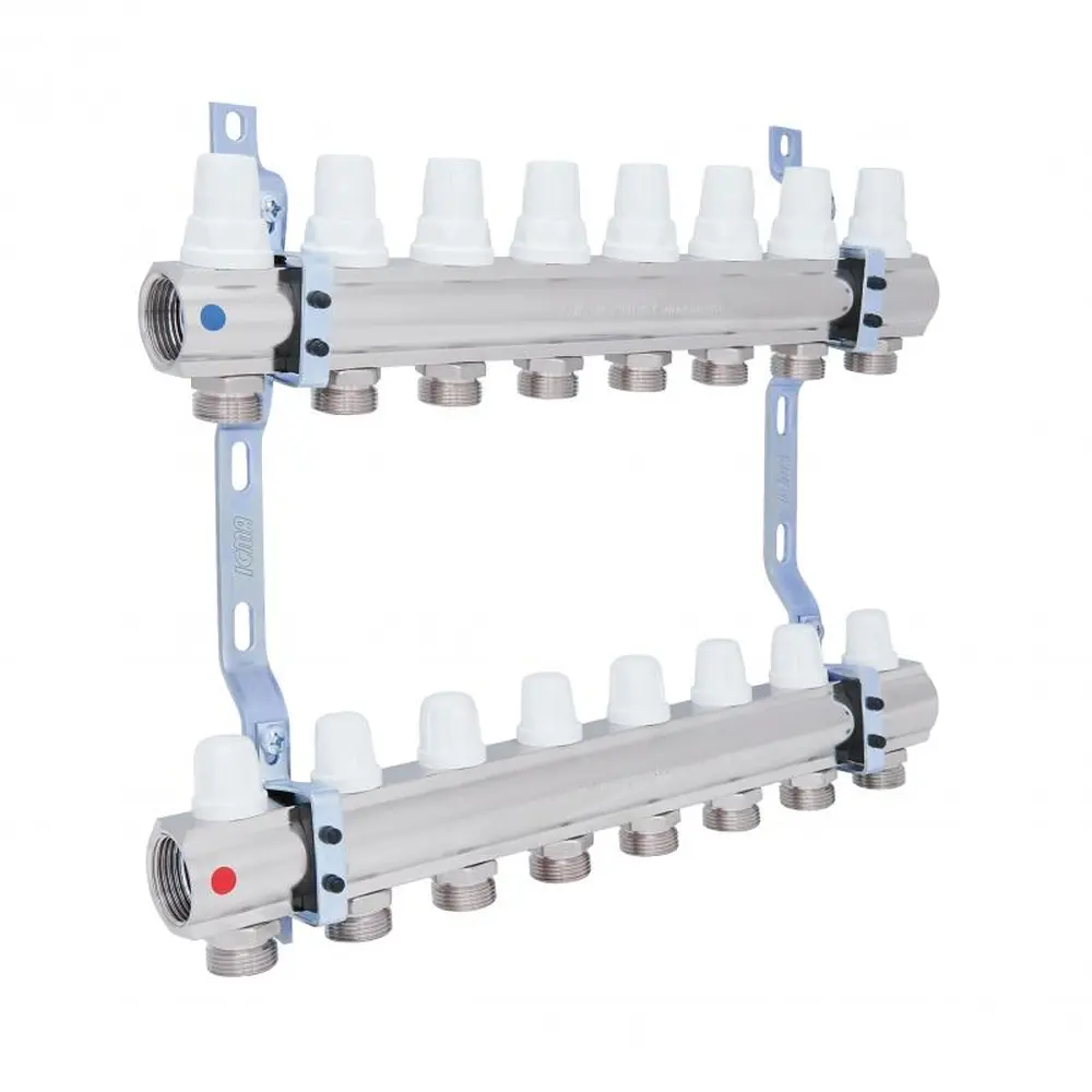 Колектор ICMA Арт. K005 з запірними кранами з мікрометричним регулюванням призначений для розподілу теплової енергії в системі опалення. Дана установка застосовується в системах радіаторного опалення. Регулювання витрати мережної води по контурах - ручна або терморегулююча. Запірні крани з мікрометричним регулюванням дозволяють перекривати подачу води і регулювати витрату мережної води в кожному контурі опалення. Колектор має 8 виходів.