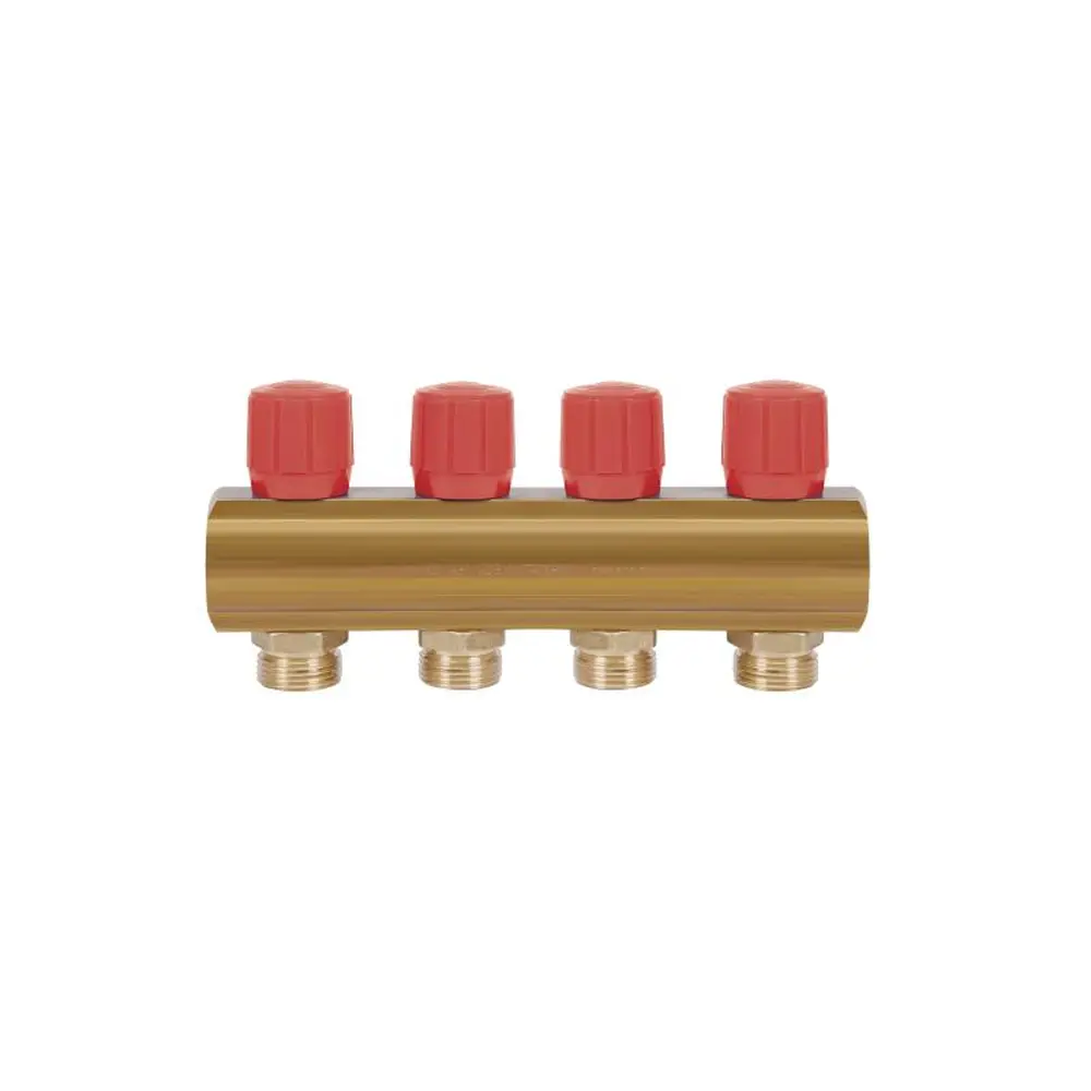 Колектор Icma з регулювальними вентилями 1" 4 виходи №1105 (Red) призначений для встановлення у системах ГХВП. Така гребінка дозволяє забезпечити рівномірний розподіл води по точках розбору. Матеріал виготовлення — латунь. Спосіб приєднання до інженерних комунікацій - різьблення (розмір підключення виходів — 3/4 дюйма). Розподільний колектор забезпечений регулювальними кранами, які налаштовують вручну. Колір ручок — червоний.
