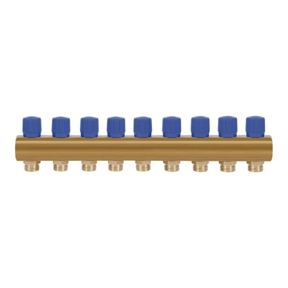 Колектор Icma з регулювальними вентилями 1" 9 виходів №1105 (Blue) призначений для розподілу потоку в системах гарячого та холодного водопостачання. Колектор з ручками управління синього кольору.