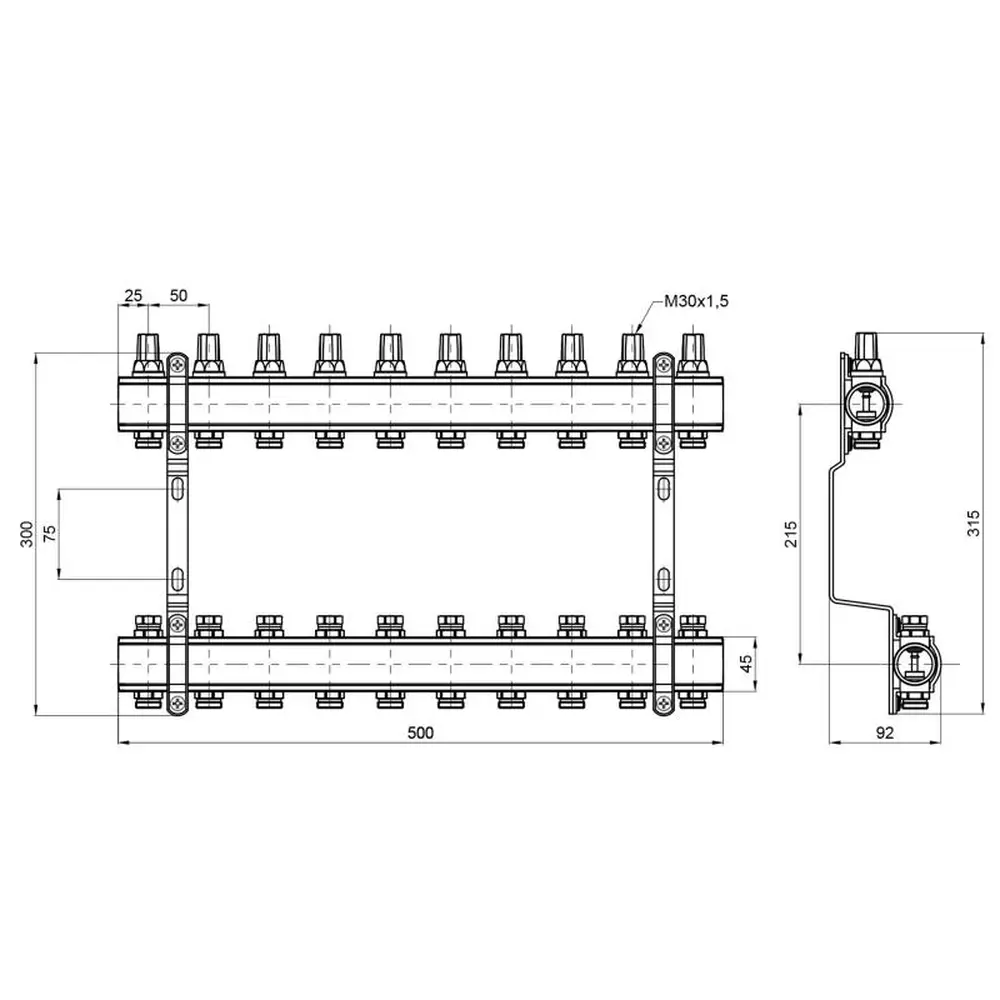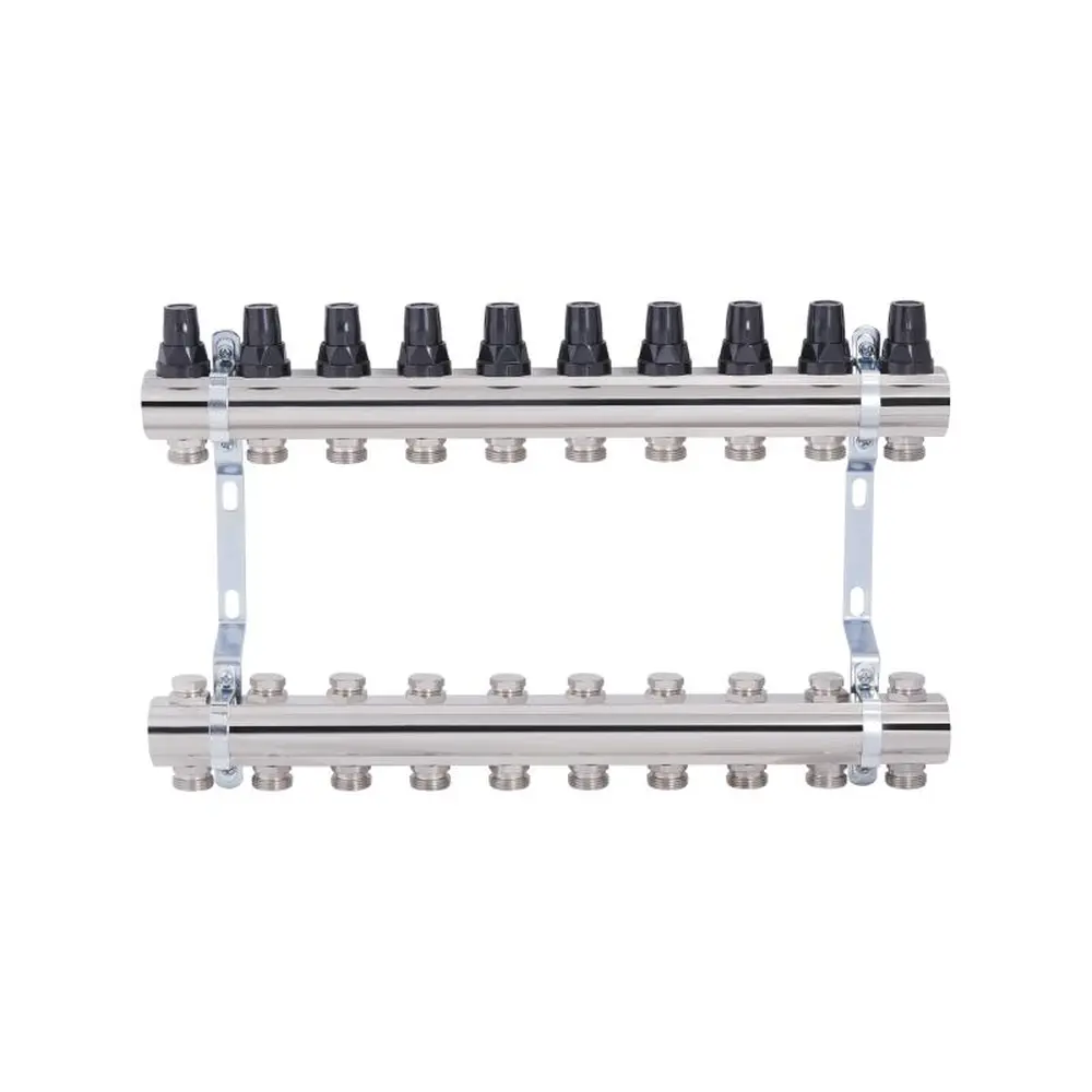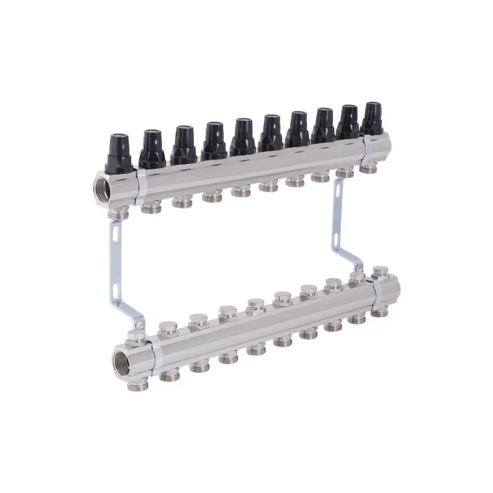 Колектор SD Forte 1" на 10 виходів стане в пригоді при необхідності під’єднати велику кількість контурів обігріву. Переважно гребінки такого типу встановлюють в системах радіаторного опалення, рідше — для теплих підлог. Основний матеріал виготовлення виробу -—латунь. У комплектацію входять: верхня балка з термоклапанами, нижня — з кранами ручного регулювання, два кронштейна для кріплення. На термостатичні клапани можна встановити сервоприводи 30х1,5. Робочий тиск — не більше 4 бар.