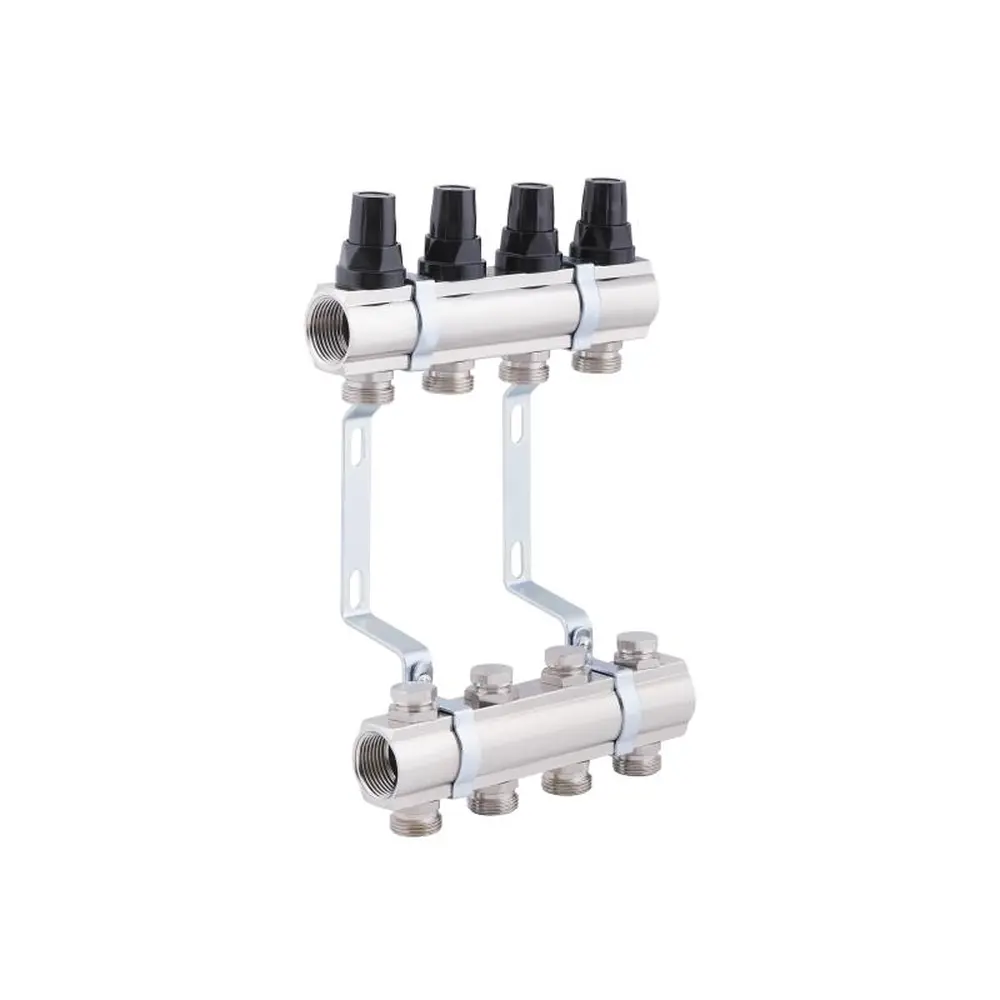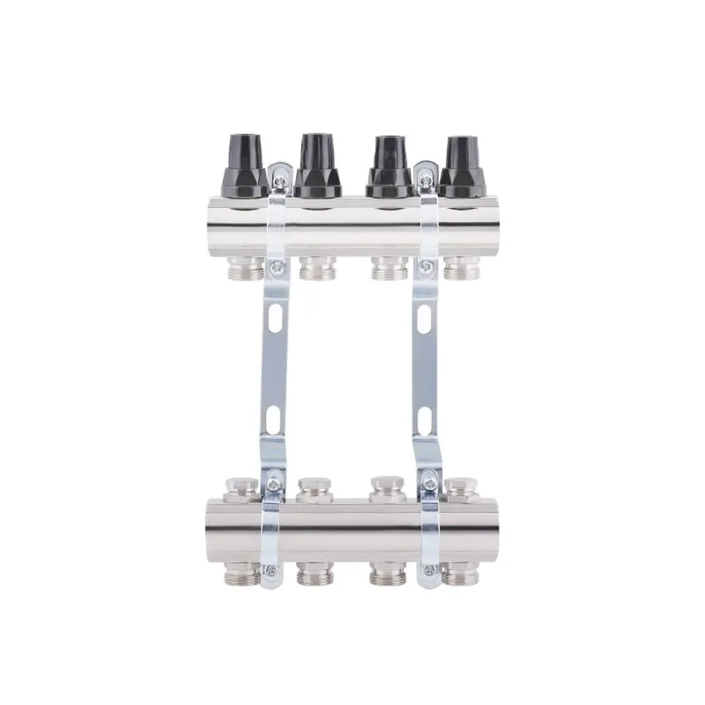 Колектор SD Forte 1 "на 4 виходи дозволить регулювати розподіл тепла в петлях системи радіаторного опалення, теплої підлоги. Верхня балка обладнана термоклапаном з ручками налаштування чорного кольору, нижня — регулювальними вентилями ручного регулювання. На термостатичні клапани можна встановити сервоприводи 30х1,5 для автоматичного управління температурним режимом в опалювальних приміщеннях. Поставляється разом з кронштейнами для кріплення в колекторній шафі або до стіни.