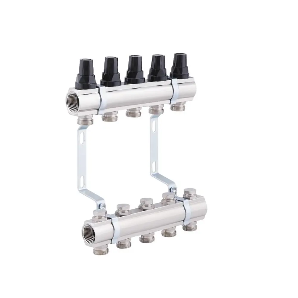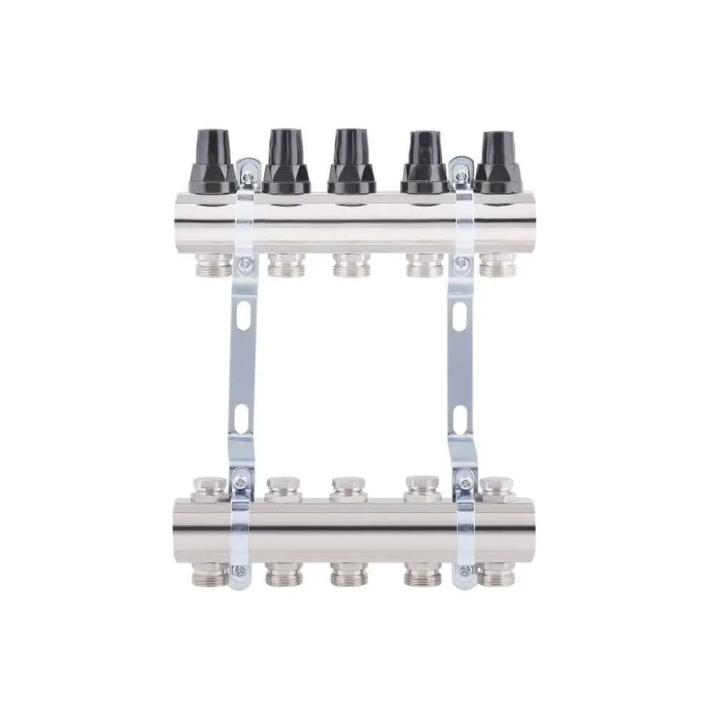 Система опалення може складатися з декількох контурів, які обігрівають різні кімнати й приміщення. Для рівномірного розподілу тепла в петлях підлоги призначений колектор SD Forte 1" на 5 виходів. Основний матеріал виготовлення виробу — латунь, верхня балка забезпечена термоклапанами з чорними ручками управління, нижня — ручними регулювальними кранами. Гребінка укомплектована двома кронштейнами для кріплення в спеціальній шафі або до стіні.