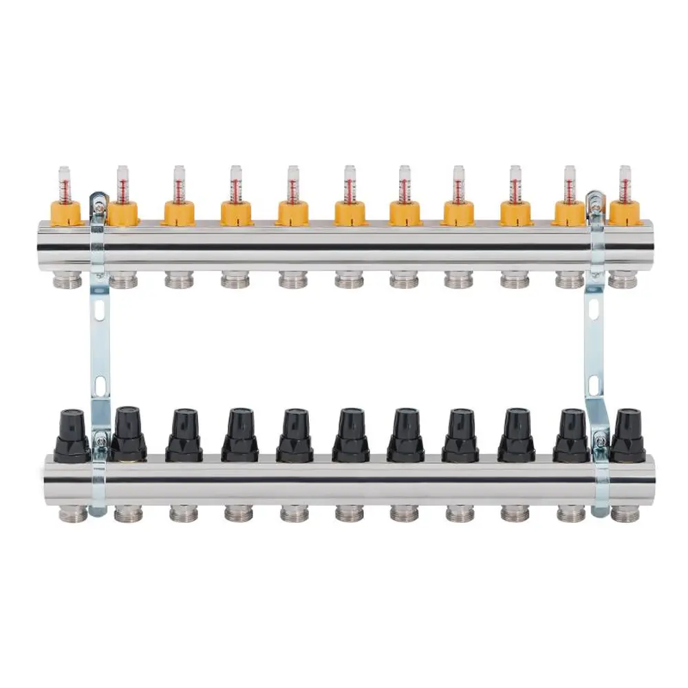Розподільчий колектор з витратомірами SD Forte 1" на 11 виходів оснащений кронштейнами для монтажу на стіні або в колекторній шафі. Пристрій призначений для рівномірного розподілу теплової енергії по всім петлям системи «тепла підлога». Витратоміри, які розташовані на лінії подачі, дозволяють проводити регулювання витрати теплоносія від 0 до 6 л/хв. Ручки термоклапанів зворотної лінії можна замінити сервоприводами 30х1,5 (необхідно купити окремо).