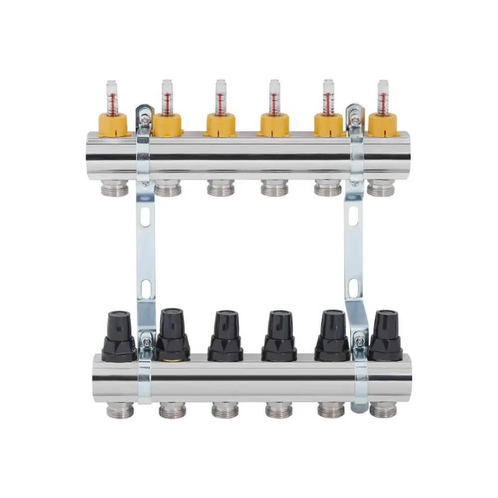 Колектор з витратомірами SD Forte 1" на 6 виходів з двома кронштейнами для кріплення до стіни або в колекторній шафі — рішення для регулювання розподілу теплоносія в контурах теплої підлоги. Балка подачі обладнана витратомірами, на лінії зворотного ходу встановлені термоклапани. Основний матеріал виготовлення виробу — латунь. Максимальний робочий тиск — 4 бари, температура рідкого носія на вході в колектор не повинна перевищувати 95 °C.