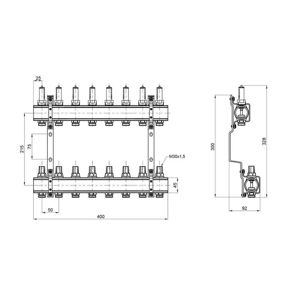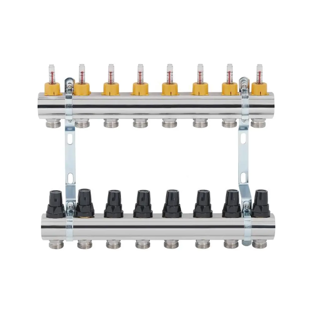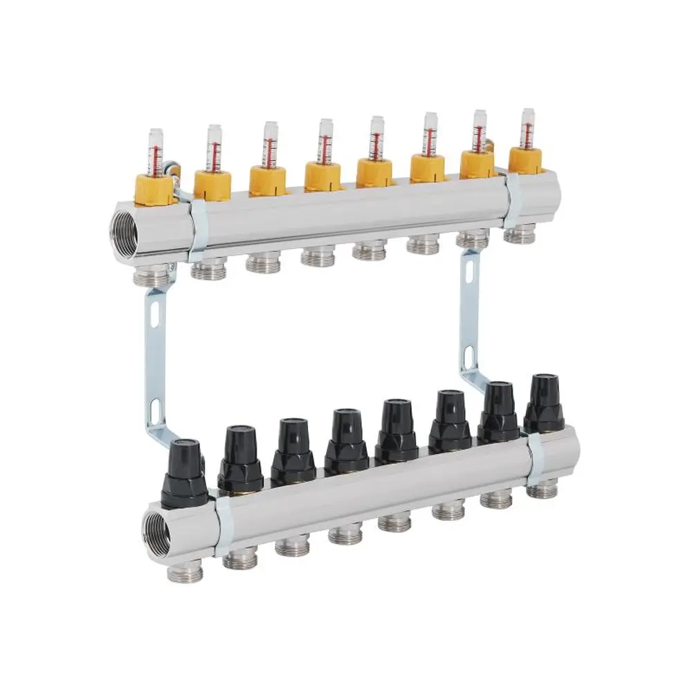 Колектор з витратомірами SD Forte 1" на 8 виходів розроблений для виконання функції розподілу тепла в контурах підлогового обігріву. В складі виробу: колекторна балка лінії подачі з витратомірами, на зворотній хід — з термостатичними клапанами, кронштейни для кріплення до стіни або у спеціальній шафі. Основний матеріал виготовлення — латунь. Максимальна температура теплоносія на вході — 95 °С. Розмір підключення петель опалення — 3/4 дюйма.