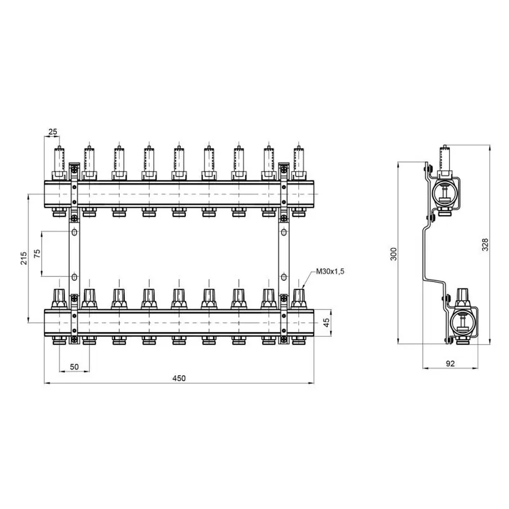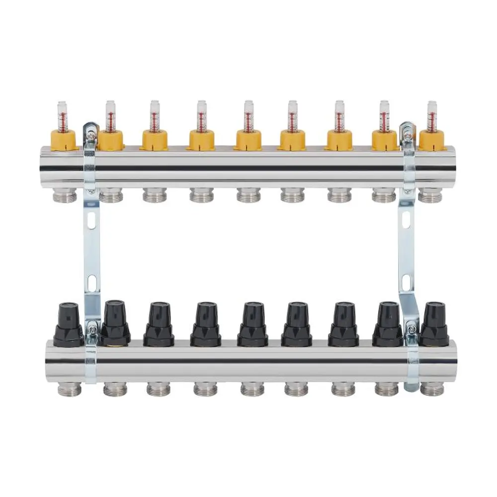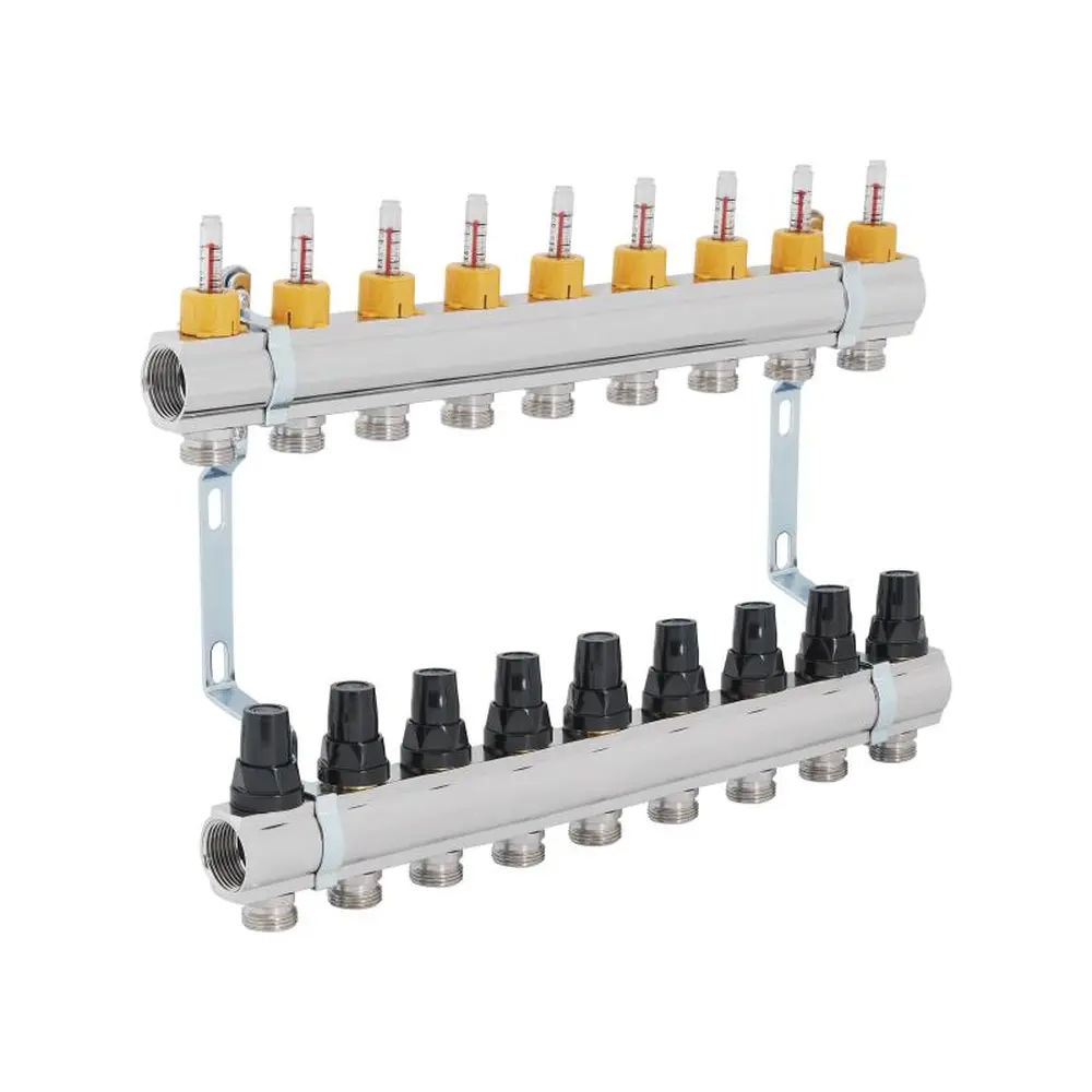 Колектор з витратомірами SD Forte 1" на 9 виходів призначений для управління розподілом тепла в контурах теплої підлоги. Колекторні балки зроблені з латуні. На лінії подачі встановлені витратоміри, які використовують для балансування системи. На зворотній — термостатичні клапани з ручками управління. Є можливість підключення сервоприводів 30х1,5 (не входять у комплектацію). Виріб поставляється зібраним на кронштейнах.