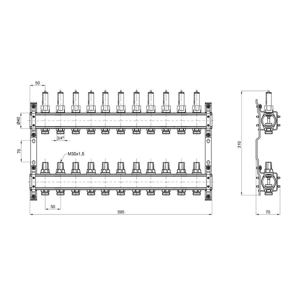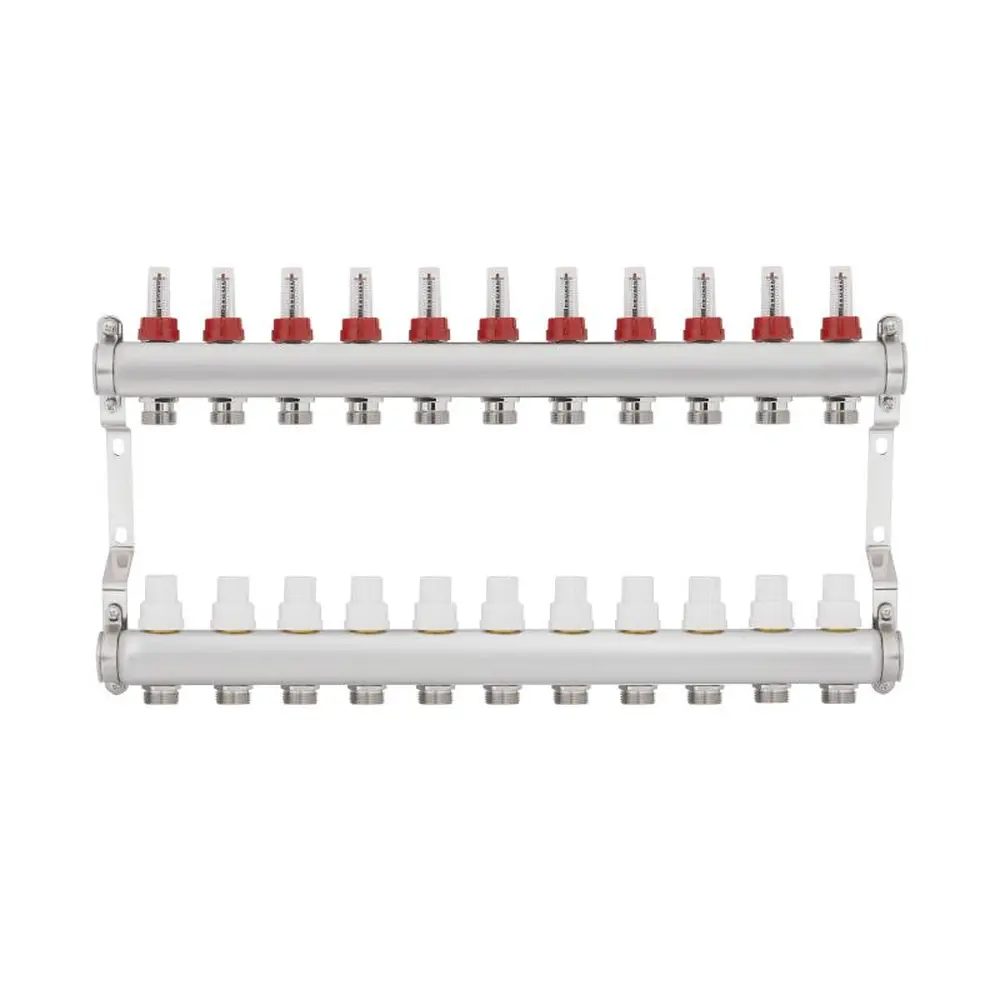 Колектор з витратомірами SD Plus 1" 11 виходів SD00411 зроблений з неіржавної сталі з нікелевим покриттям і забезпечений витратомірами та термостатичними клапанами. Функція виробу – розподіл теплоносія по контурах системи «тепла підлога» (розмір під’єднання петель – 3/4 дюйми). Для монтажу на стіні або у шафі в комплектації є спеціальні кронштейни. Маса виробу – 5,7 кг, відстань між осями виходів становить 5 см.