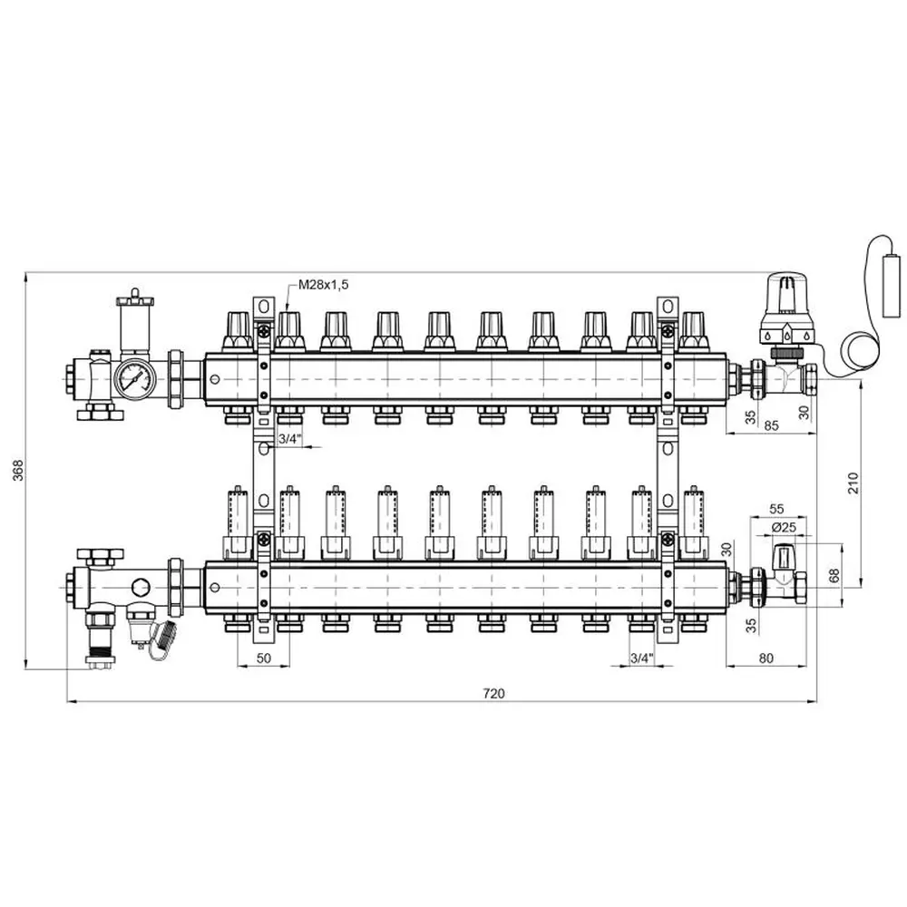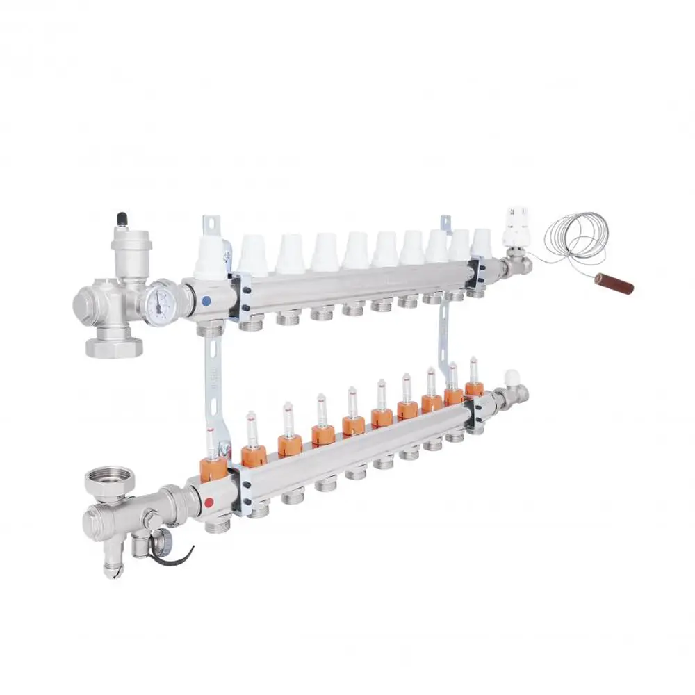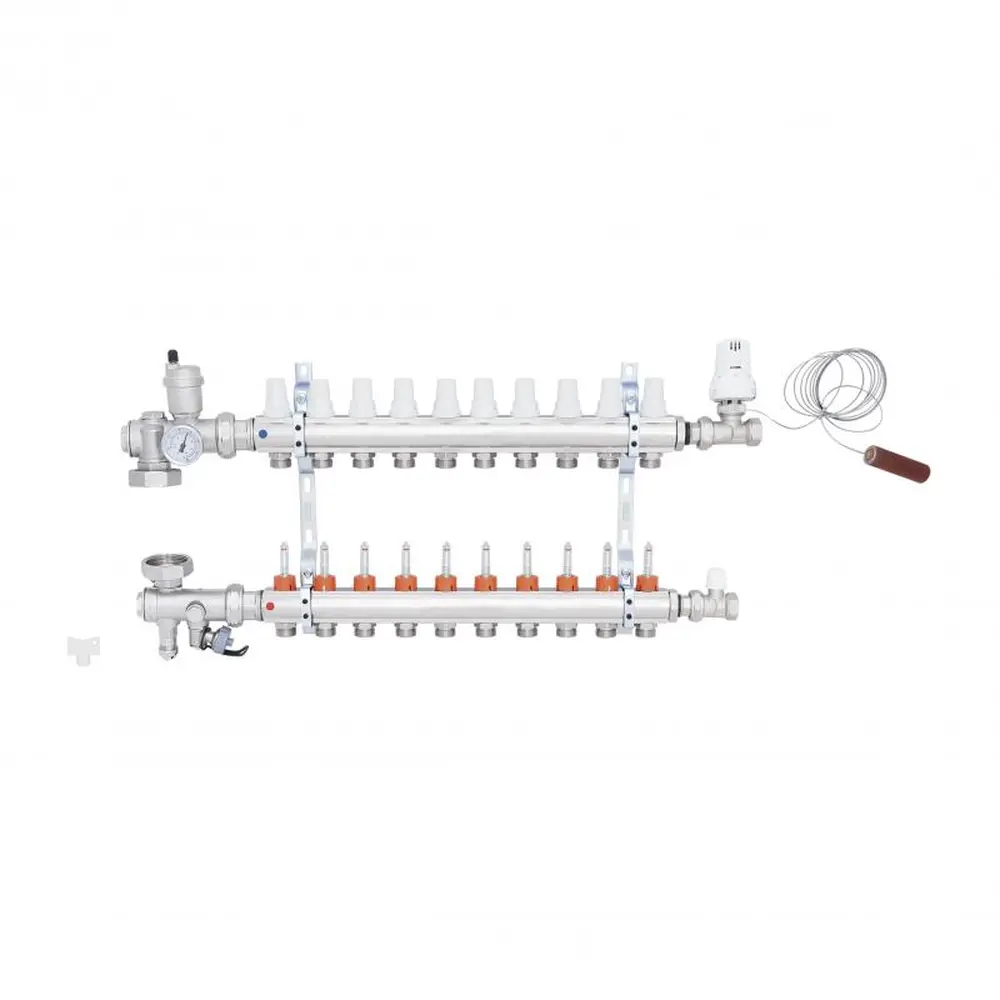 Колекторна група в зборі ICMA Арт. A2K013 призначена для розподілу теплоносія в системі опалення теплої підлоги, має десять виходів і допомагає поліпшити управління опаленням в окремих контурах системи опалення підлоги. Колектор забезпечує просту і точне регулювання витрати теплоносія в одиничному контурі всієї системи «Тепла підлога», і при необхідності забезпечують повне перекриття окремих контурів системи.
