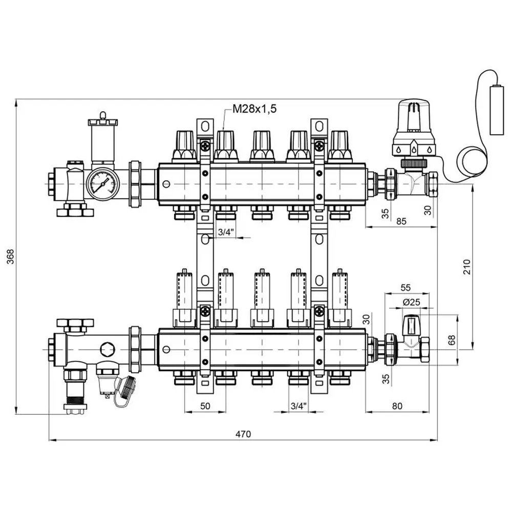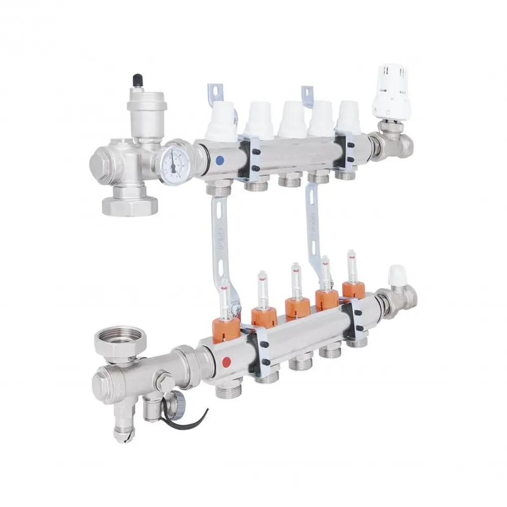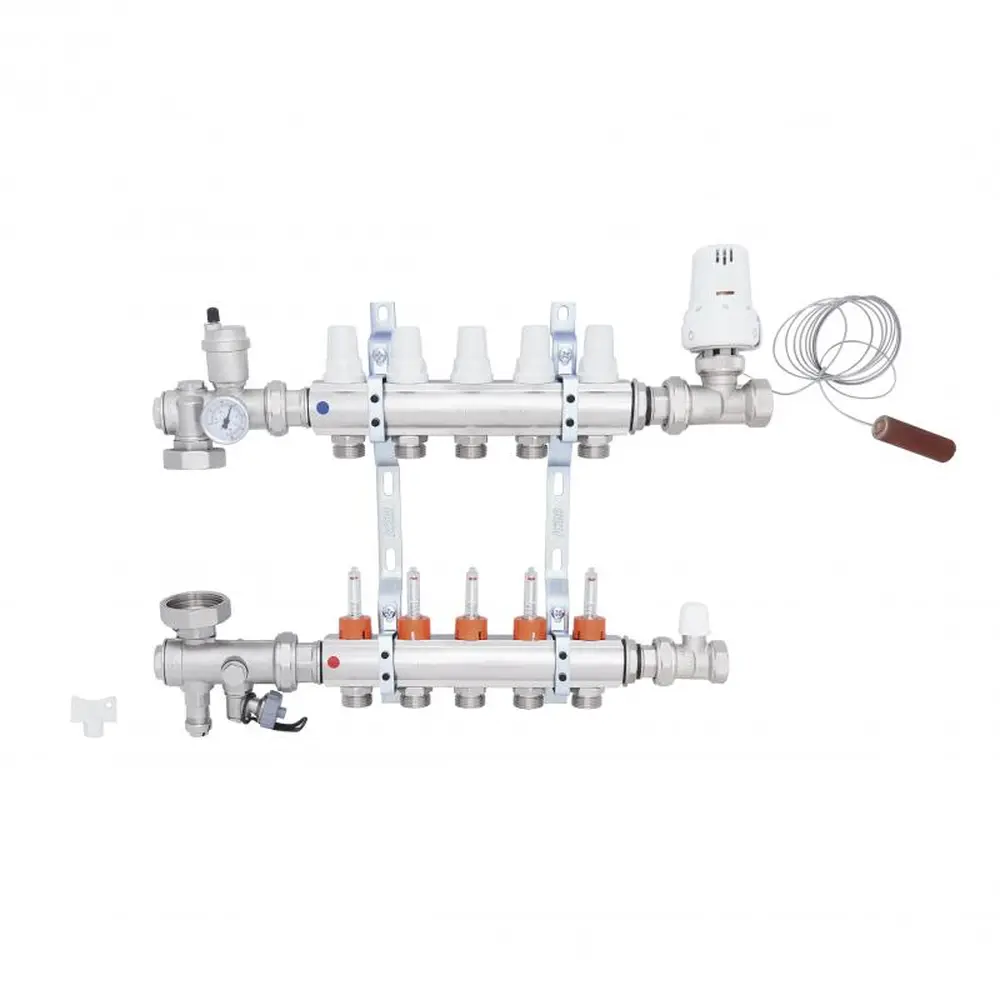 Колекторна група в зборі ICMA Арт. A2K013 призначена для розподілу теплоносія в системі опалення теплої підлоги, має п‘ять виходів і допомагає поліпшити управління опаленням в окремих контурах системи опалення підлоги. Колектор забезпечує просту і точне регулювання витрати теплоносія в одиничному контурі всієї системи «Тепла підлога», і при необхідності забезпечують повне перекриття окремих контурів системи.