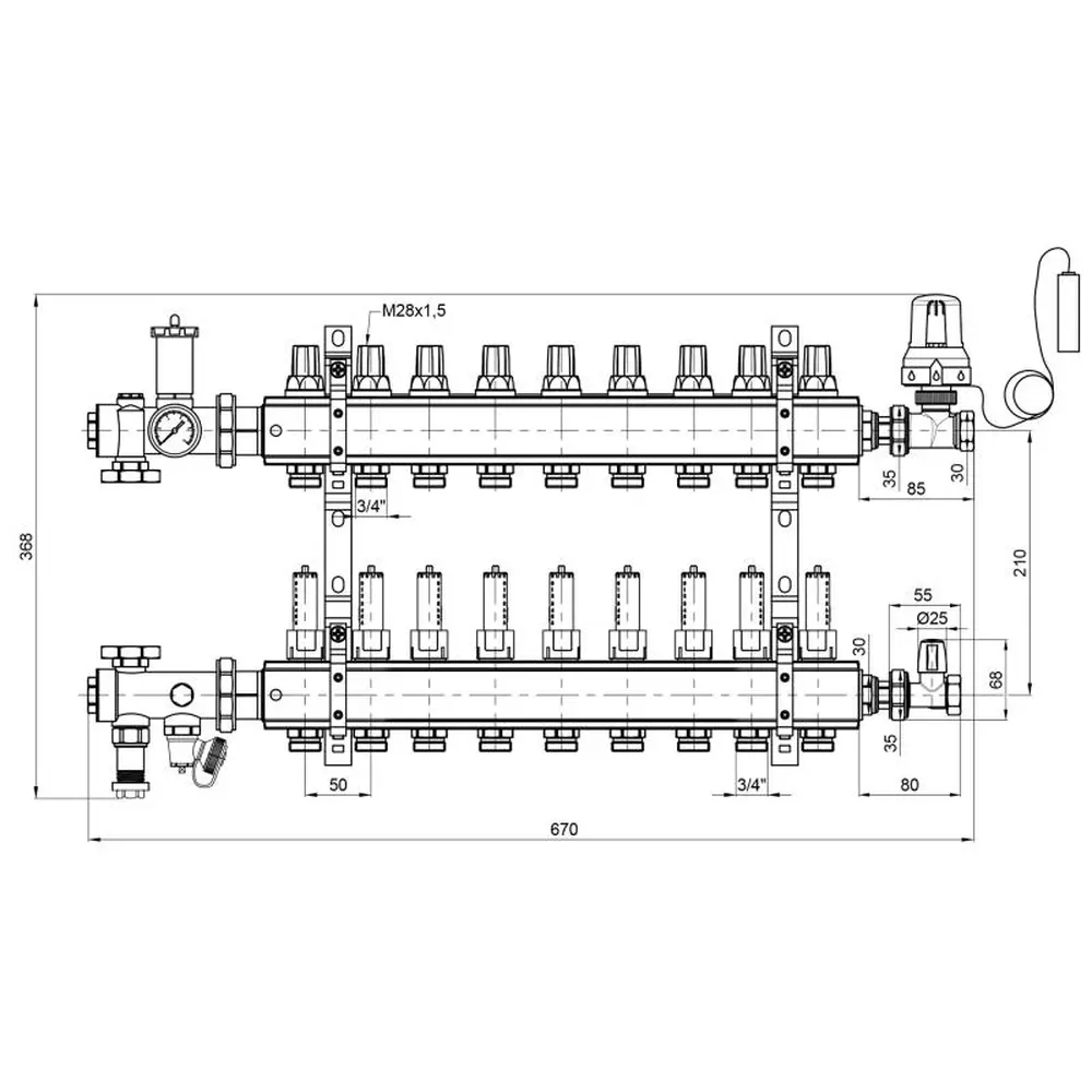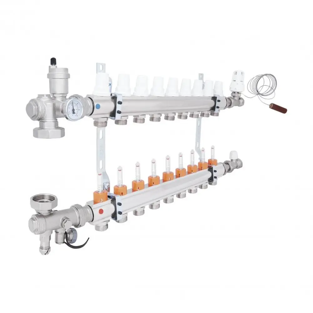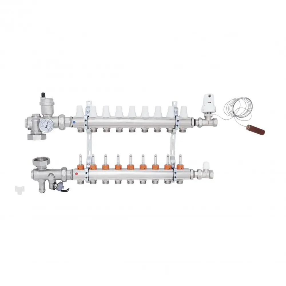 Колекторна група в зборі ICMA Арт. A2K013 призначена для розподілу теплоносія в системі опалення теплої підлоги, має дев‘ять виходів і допомагає поліпшити управління опаленням в окремих контурах системи опалення підлоги. Колектор забезпечує просту і точне регулювання витрати теплоносія в одиничному контурі всієї системи «Тепла підлога», і при необхідності забезпечують повне перекриття окремих контурів системи.