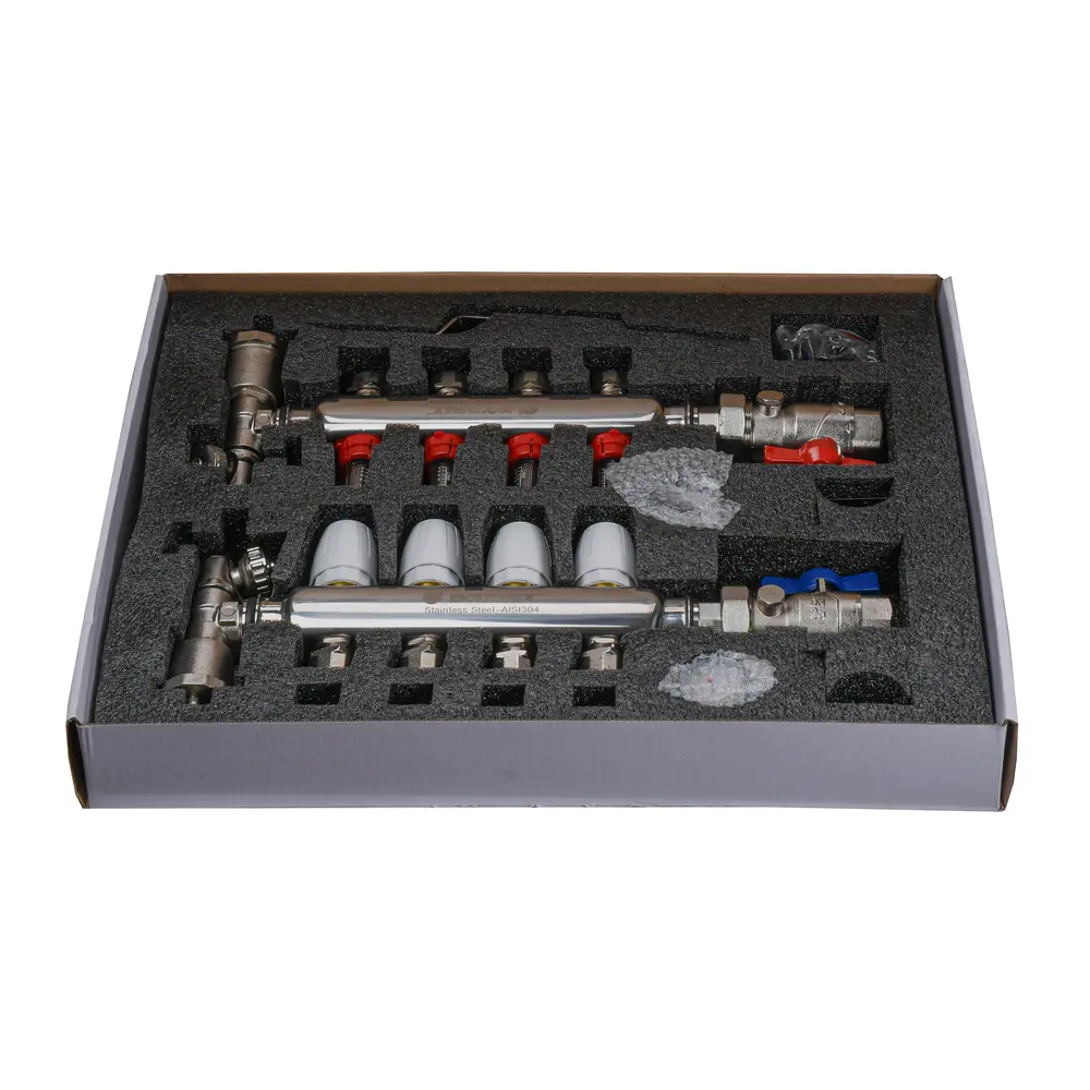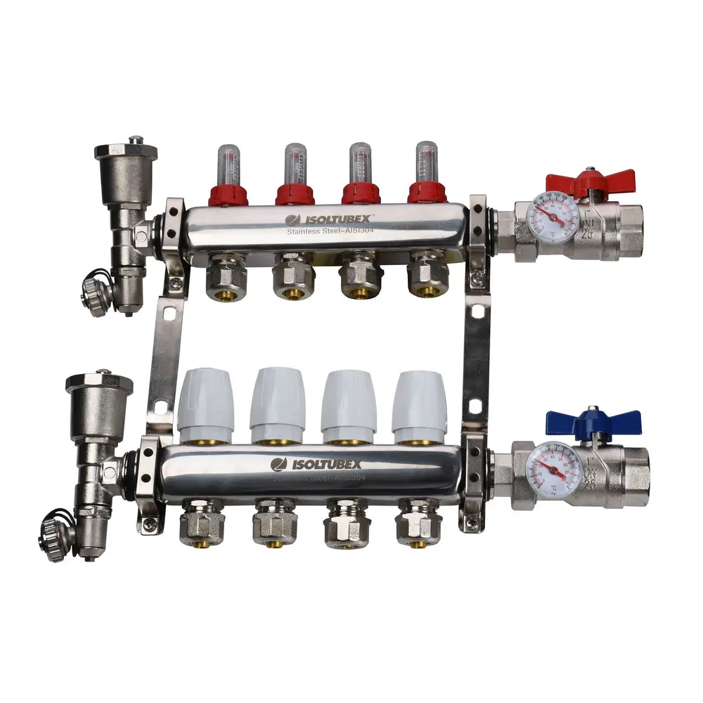 Материал коллектора нержавеющая сталь, арматуры и фитингов - латунь CW617N, уплотнителями и золотниковых прокладок - EPDM. В комплект входят крепления.