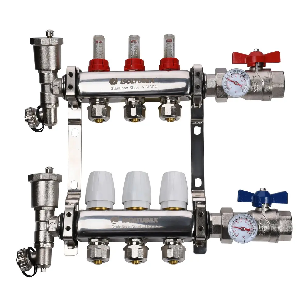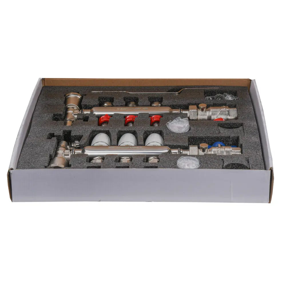 Матеріал колектора нержавіюча сталь, арматури і фітингів - латунь CW617N, ущільнювачами та золотникових прокладок - EPDM. У комплект входять кріплення.