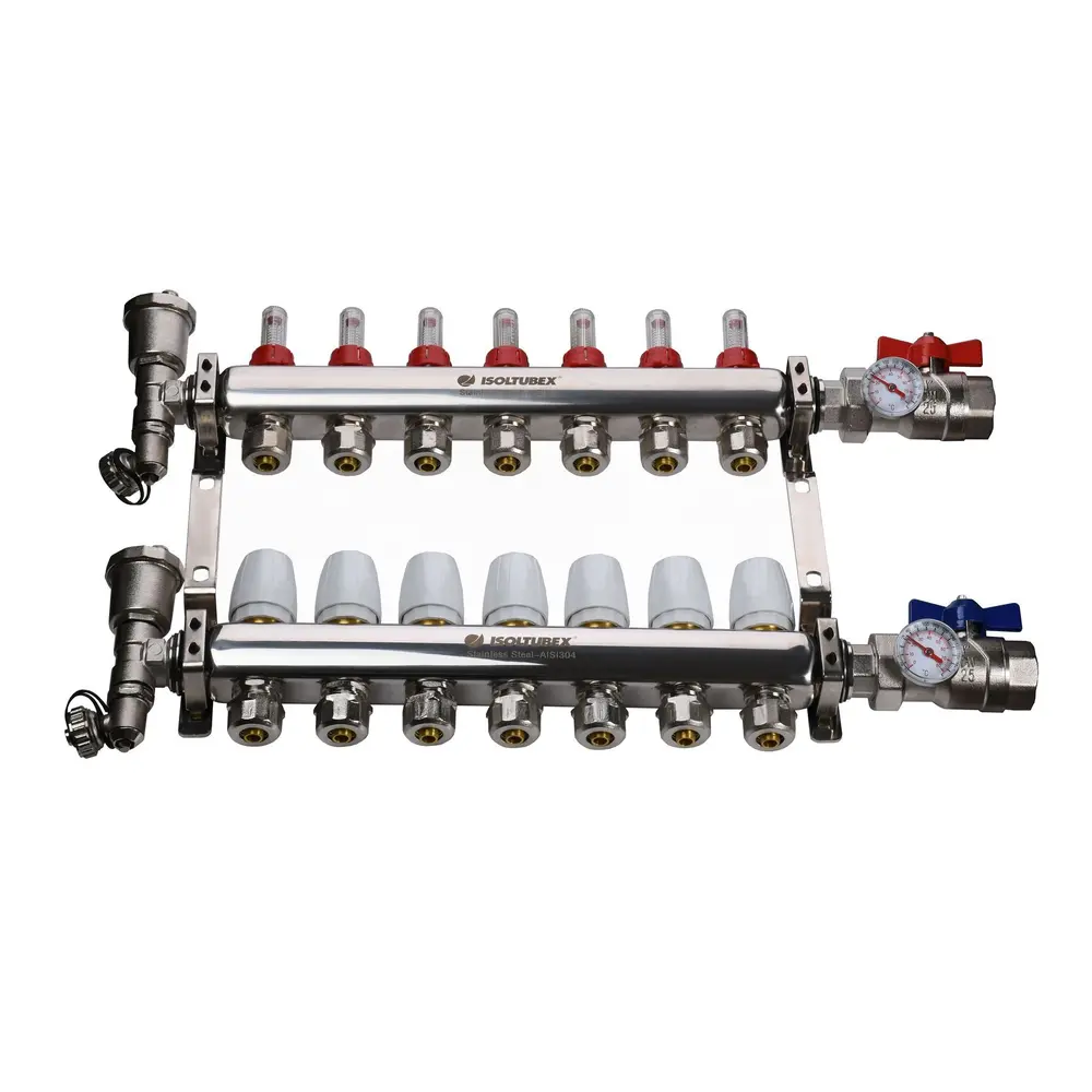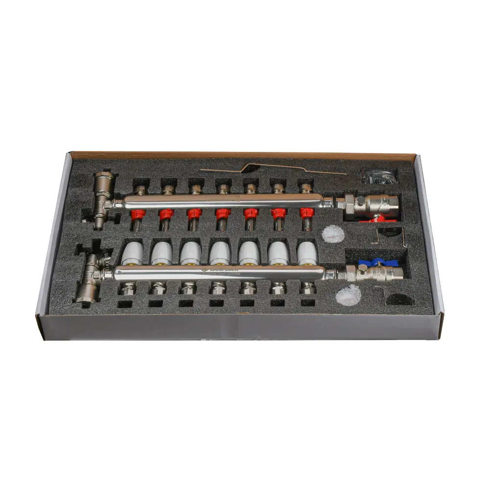 Матеріал колектора нержавіюча сталь, арматури і фітингів - латунь CW617N, ущільнювачами та золотникових прокладок - EPDM. У комплект входять кріплення.