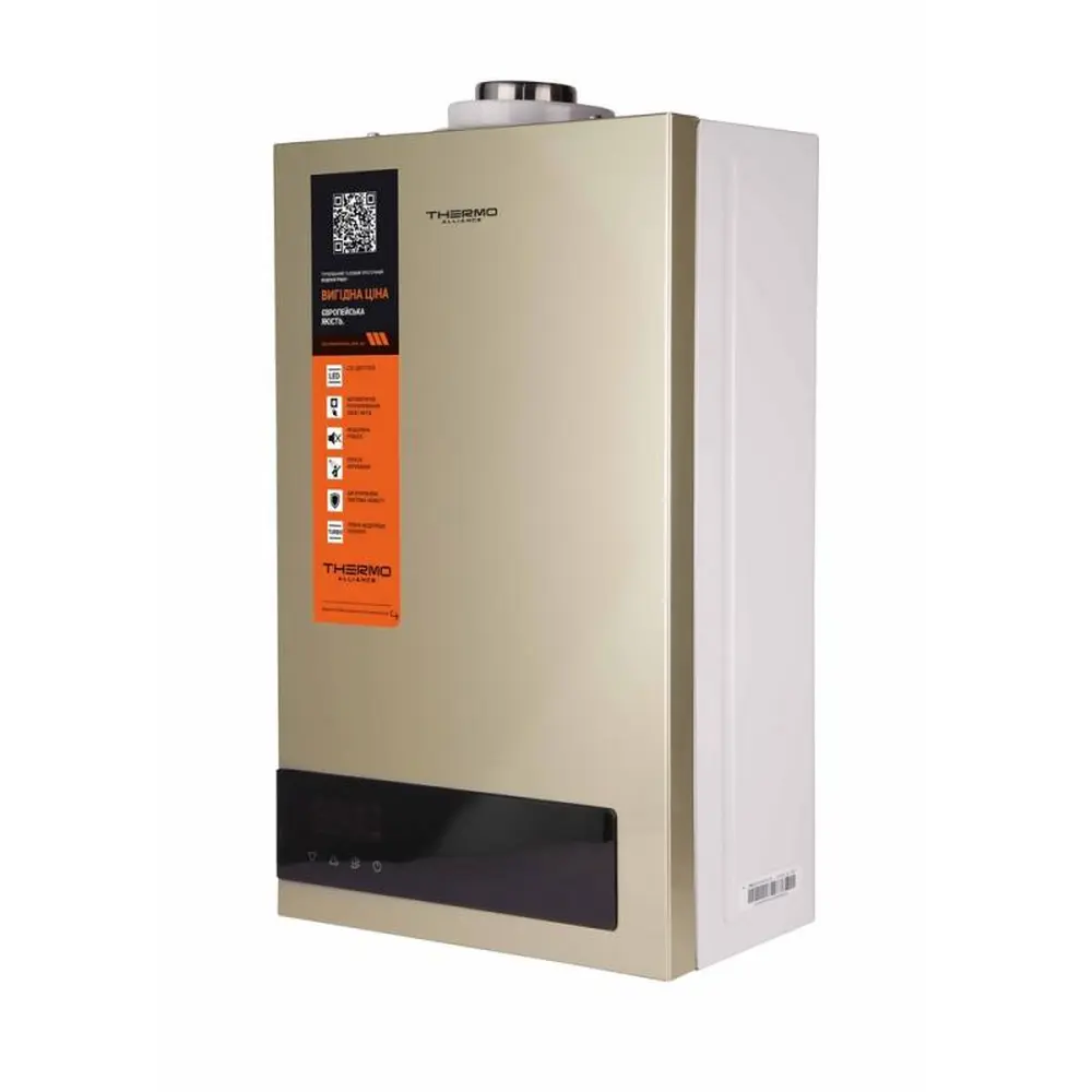 Газова колонка Thermo lliance турбірована JSG20-10ET P18 10 л Gold — проточний газовий водонагрівач з закритою камерою згоряння. Виріб має естетичний дизайн та високу функціональністю. Зручна панель управління обладнана електронним дисплеєм, на якому відображена інформація про роботу пристрою. Електроживлення подається за допомогою кабелю від мережі 220 В, 50 Гц. Запальник починає працювати тільки після того, як відкривають кран на точці розбору у мережі ГВП