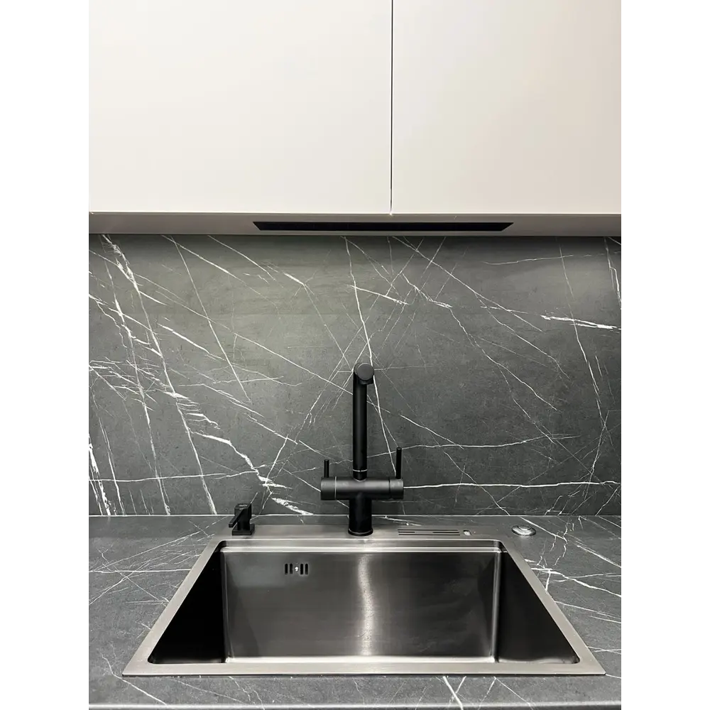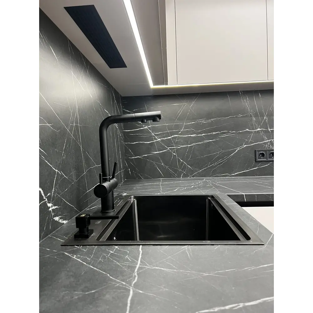 Всі компоненти змішувача відточені до чорного відтінку, щоб гармонійно вписуватися в інтер'єр та ідеально комбінуватися з чорними мийками.