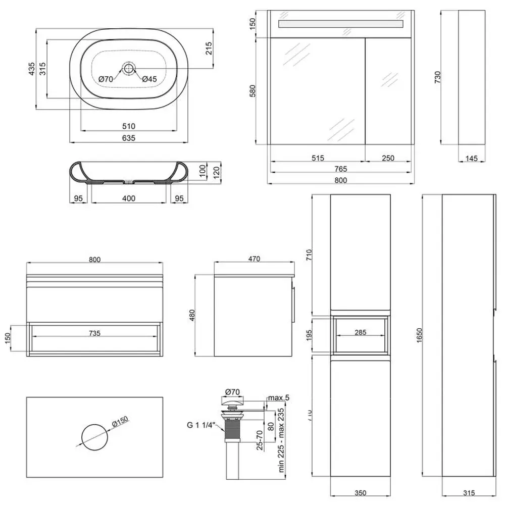Тумба під раковину + дзеркальна шафа + пенал + раковина