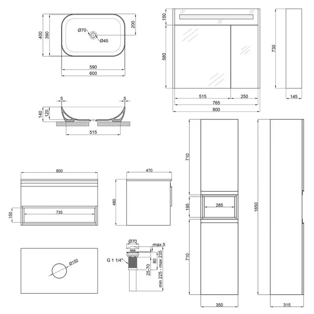 Тумба під раковину + дзеркальна шафа + пенал + раковина