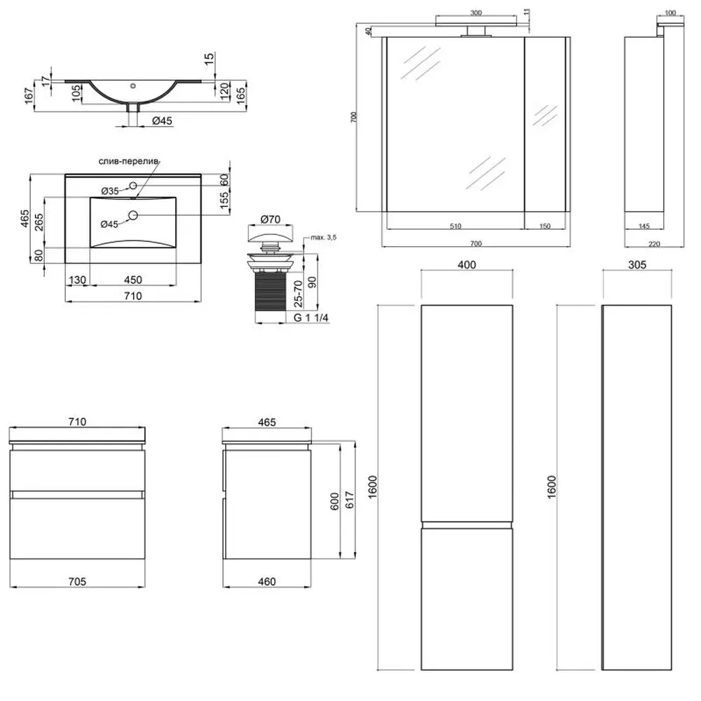 Тумба з раковиною + дзеркальна шафа + пенал