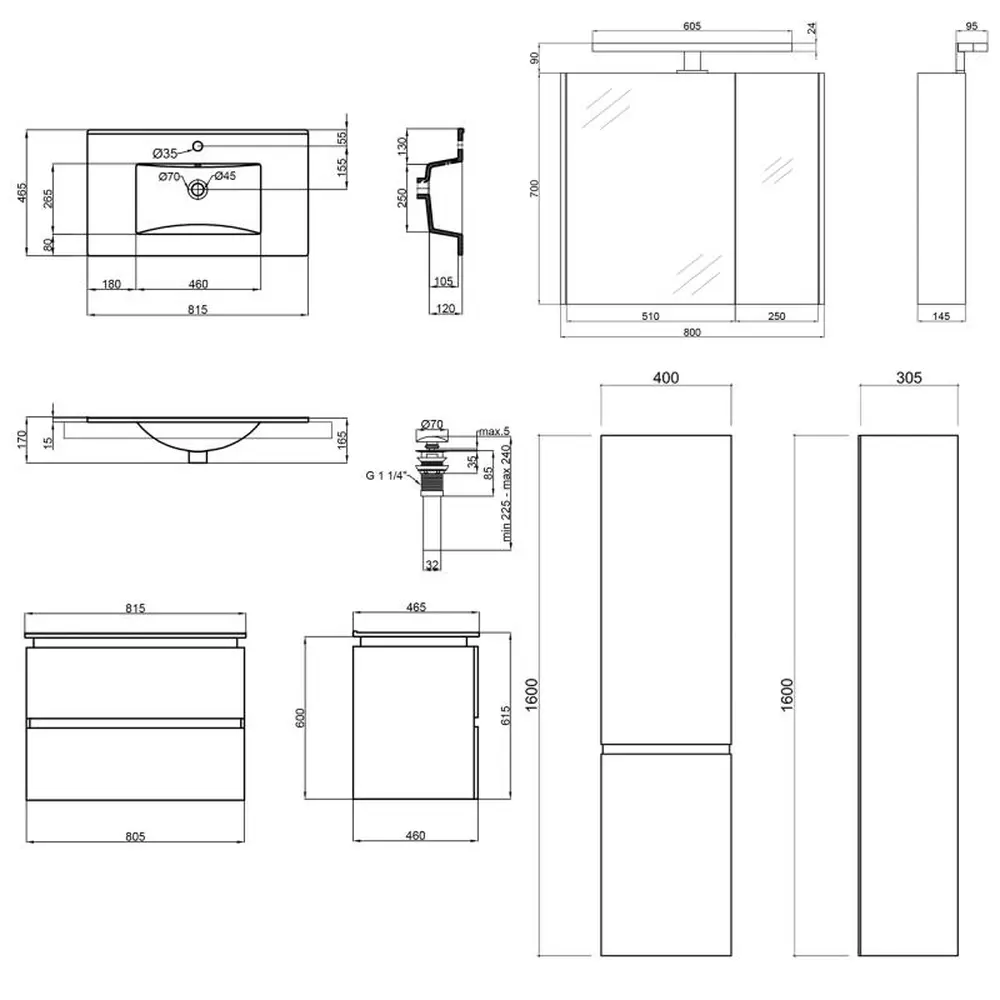 Тумба під раковину + дзеркальна шафа + пенал + раковина