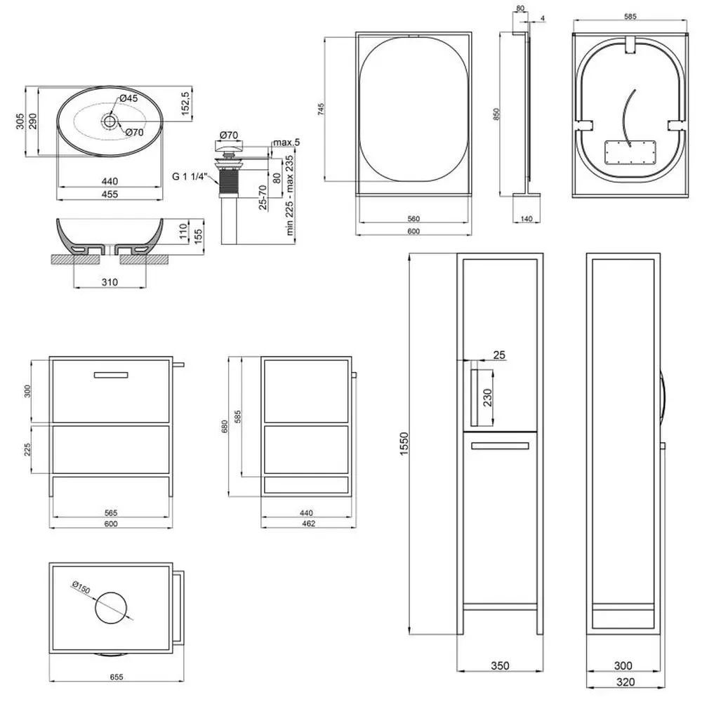 Тумба під раковину + дзеркальна шафа + пенал + раковина