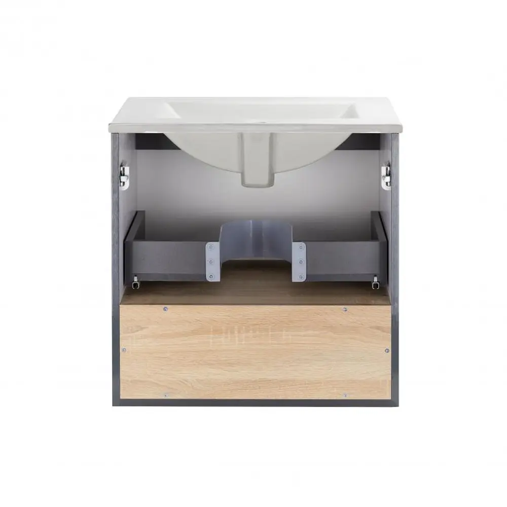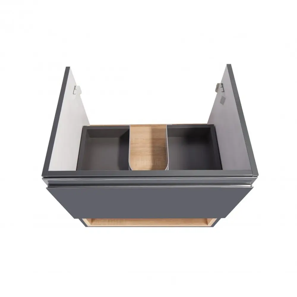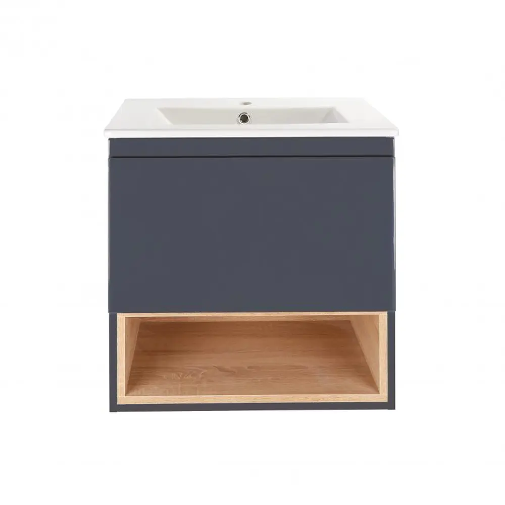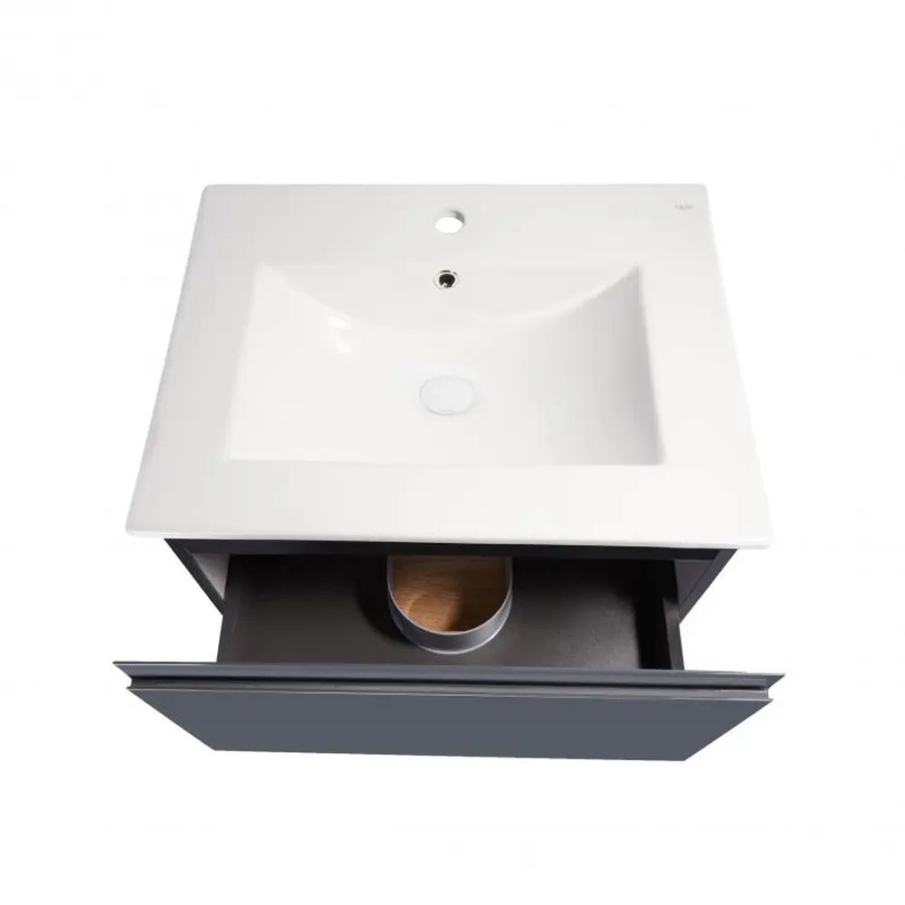 Підвісна тумба з раковиною Qtap Robin QT1372TPВ6002GWO виконана в лаконічному стилі, що доповнить дизайн будь-якої ванної кімнати. Раковина виготовлена з якісної кераміки білого кольору, вона має отвір під сифон і перелив. Корпус тумби сірого кольору виготовлений з ЛДСП, фасадна частина - з МДФ з глянцевим покриттям. Виріб оснащений зручним і містким висувним ящиком з механізмом доведення, а також стильною полицею кольору білого дуба.