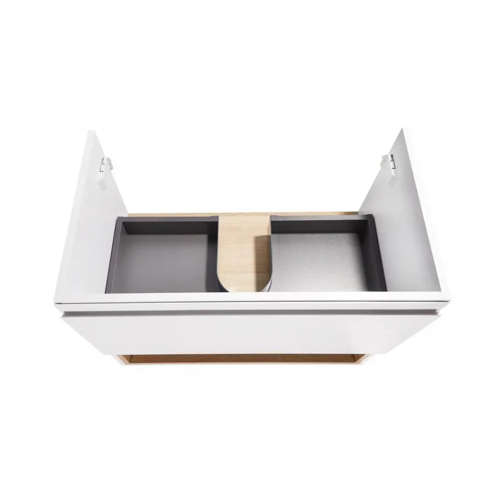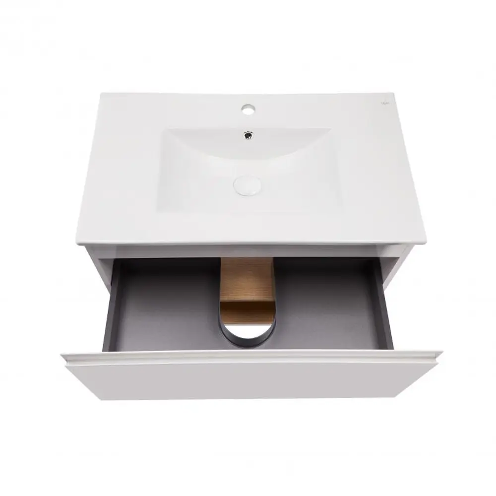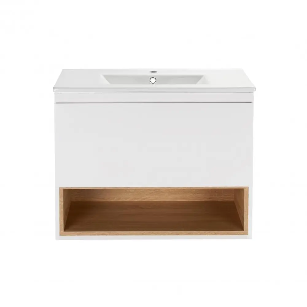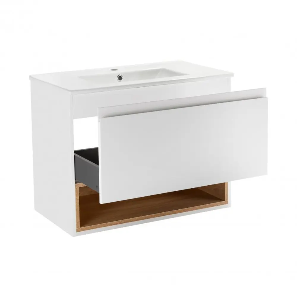 Підвісна тумба з раковиною Qtap Robin QT1372TPВ7001WWO виконана в лаконічному стилі, що доповнить дизайн будь-якої ванної кімнати. Раковина виготовлена з якісної кераміки білого кольору, вона має отвір під сифон і перелив. Корпус тумби білого кольору виготовлений з ЛДСП, фасадна частина - з МДФ з глянцевим покриттям. Виріб оснащений зручним і містким висувним ящиком з механізмом доведення, а також стильною полицею кольору білого дуба.