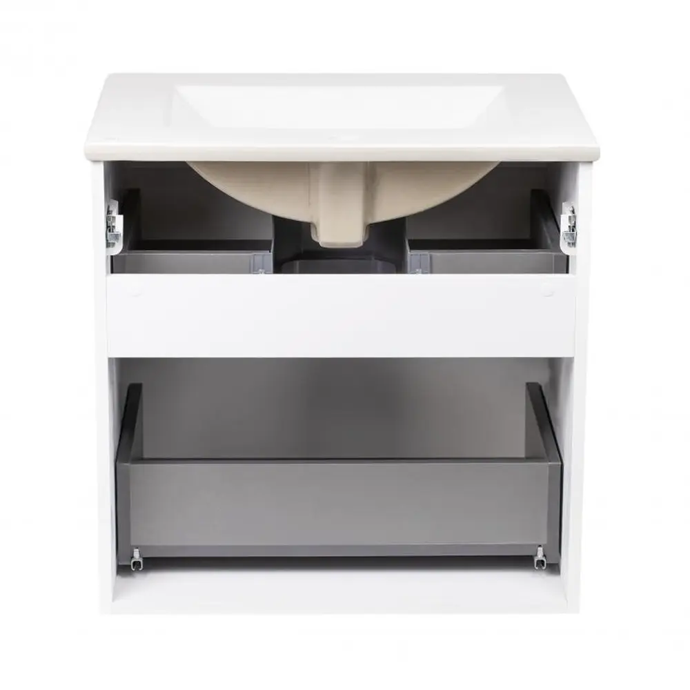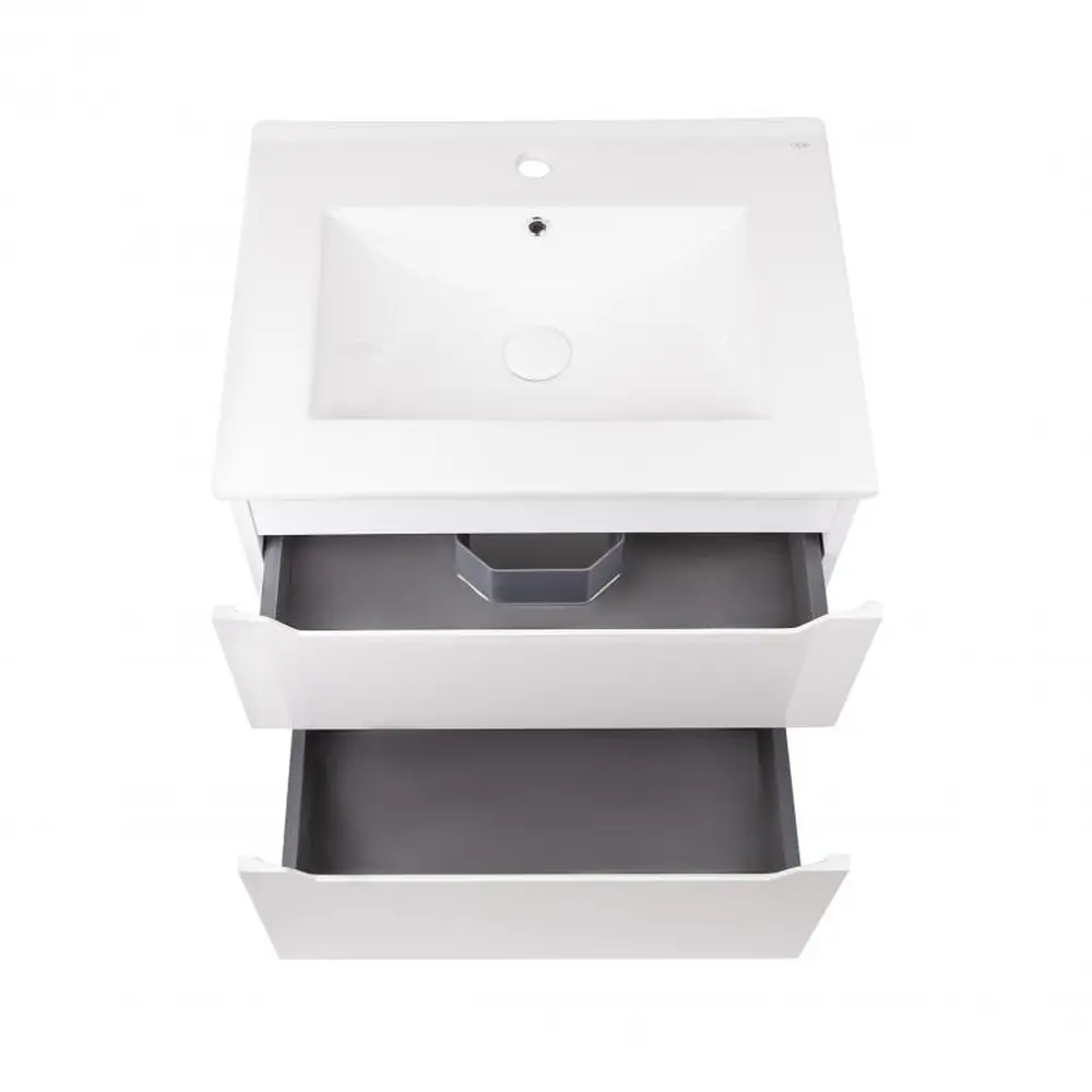 Підвісна тумба з раковиною Qtap Scorpio QT1472TPВ6013060CW виконана в лаконічному стилі, який доповнить дизайн будь-якої ванної кімнати. Раковина виготовлена з якісної кераміки білого кольору, вона виконана з отвором під сифон і переливом. Корпус тумби білого кольору виготовлений з ЛДСП, фасадна частина - з МДФ з глянсовим покриттям. Оснащена двома висувними ящиками з механізмом доводчика.