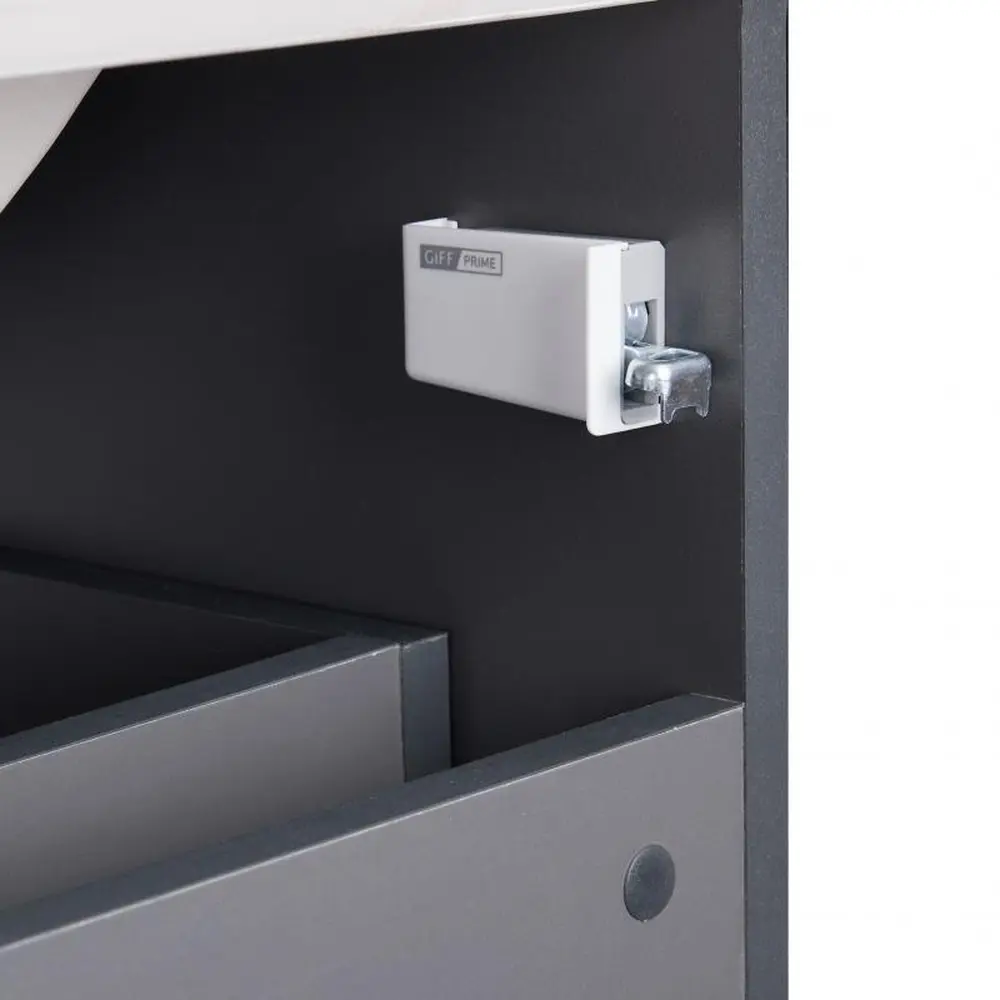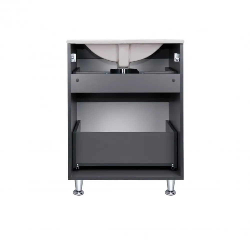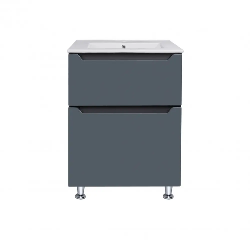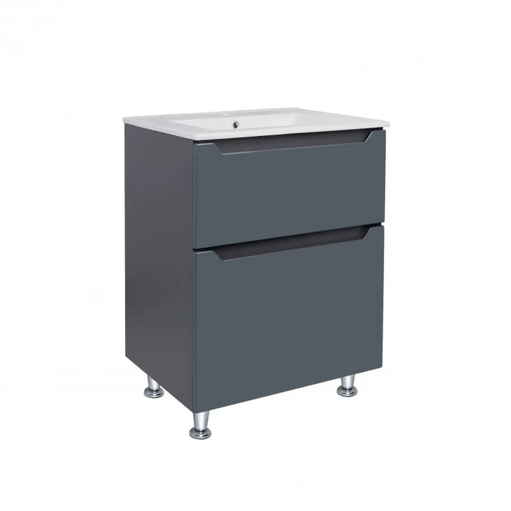 Комплект Qtap Scorpio 605х825х460 Graphite Підлогова тумба + раковина урізна QT1471TNВ6023060CG виконана в лаконічному стилі, який доповнить дизайн будь-якої ванної кімнати. Раковина виготовлена з якісної кераміки білого кольору, вона виконана з отвором під сифон і переливом. Корпус виробу сірого кольору виготовлений з ЛДСП, фасадна частина - з МДФ з глянцевим покриттям. Тумба обладнана двома зручними висувними ящиками з механізмом доведення. У комплектацію входять чотири металеві ніжки.