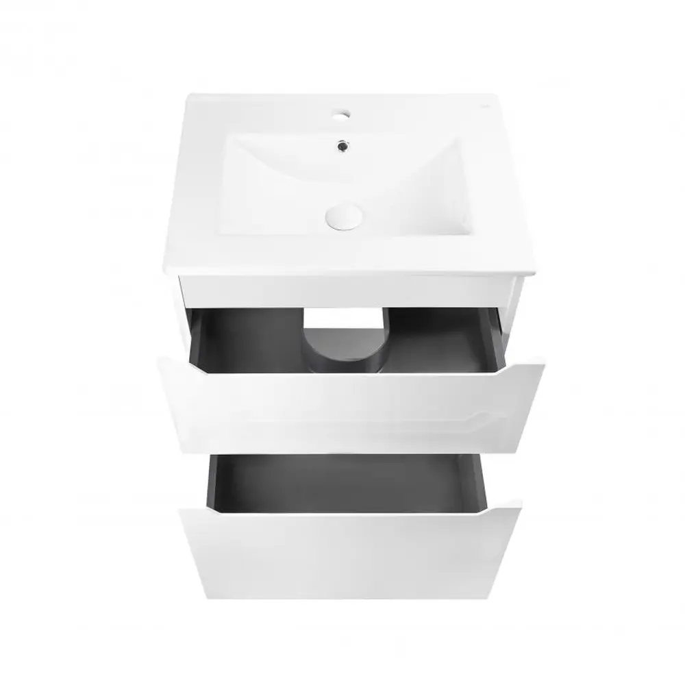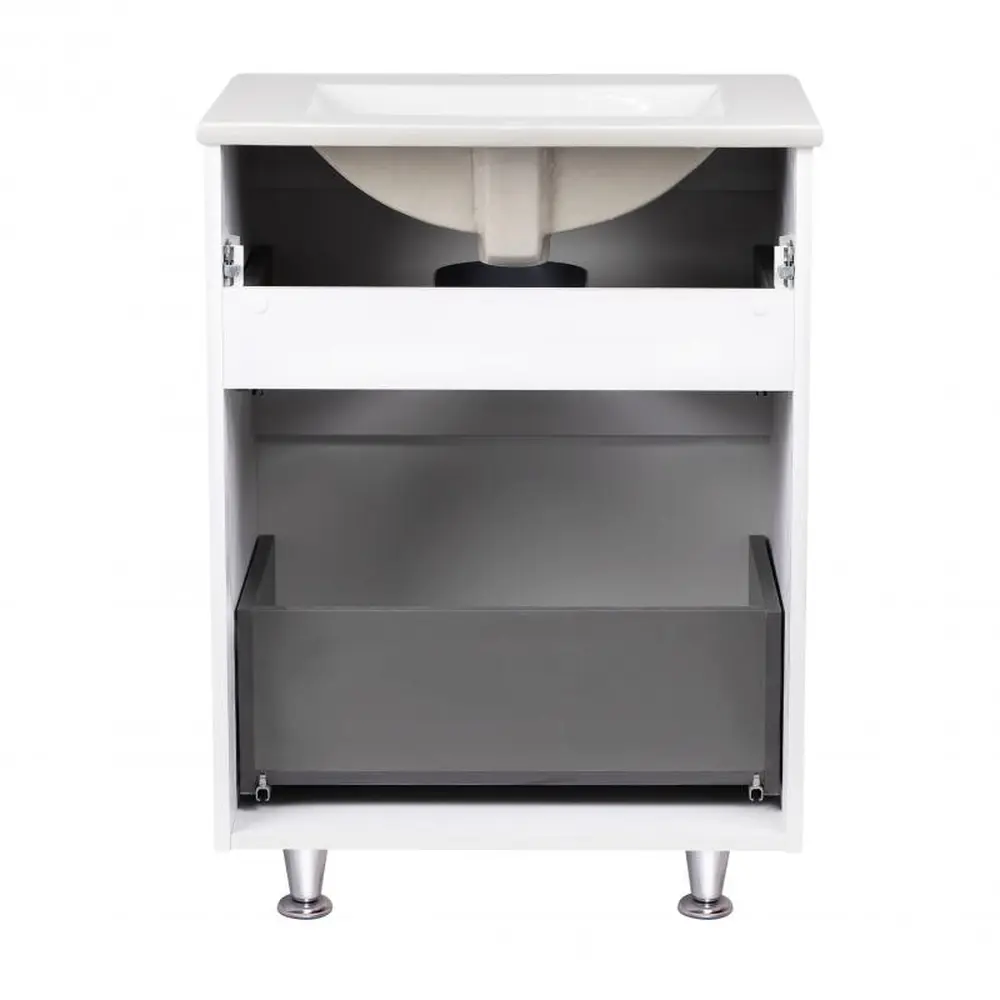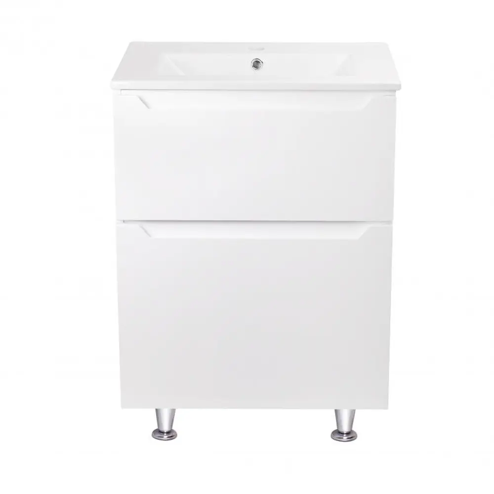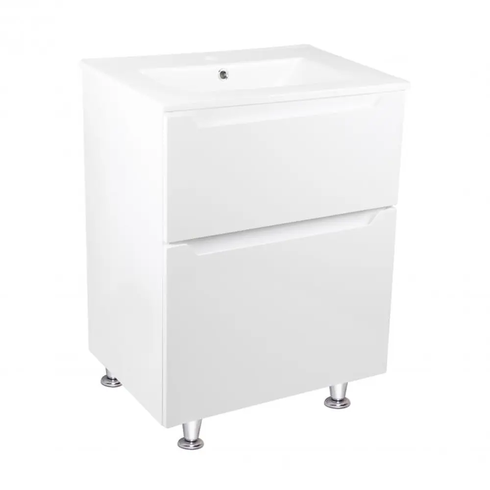 Підлогова тумба з умивальником Qtap Scorpio QT1471TNВ6013060CW виконана в лаконічному стилі, який доповнить дизайн будь-якої ванної кімнати. Раковина виготовлена з якісної кераміки білого кольору, вона виконана з отвором під сифон і переливом. Корпус тумби білого кольору виготовлений з ЛДСП, фасадна частина - з МДФ з глянцевим покриттям. Оснащена двома висувними ящиками з механізмом доводчика. У комплекті чотири стійкі металеві ніжки.