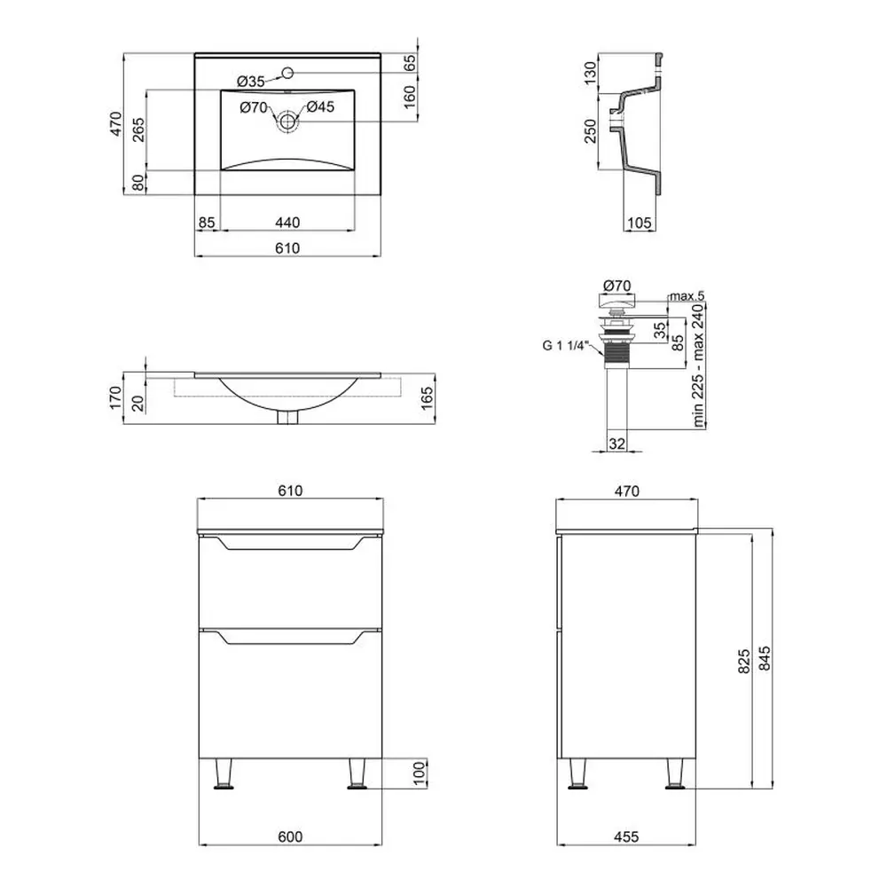 Тумба, раковина, донний клапан, дюбель розпірний з L-подібним гаком, ніжки.