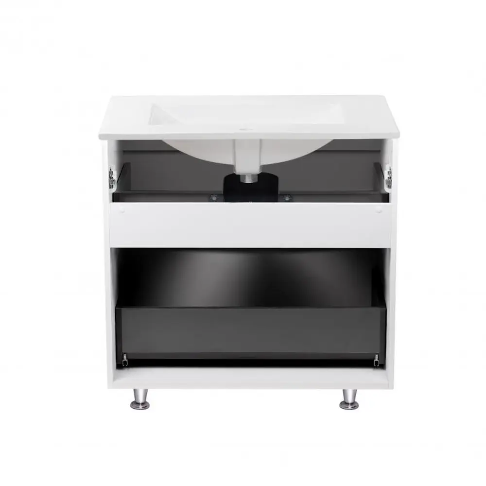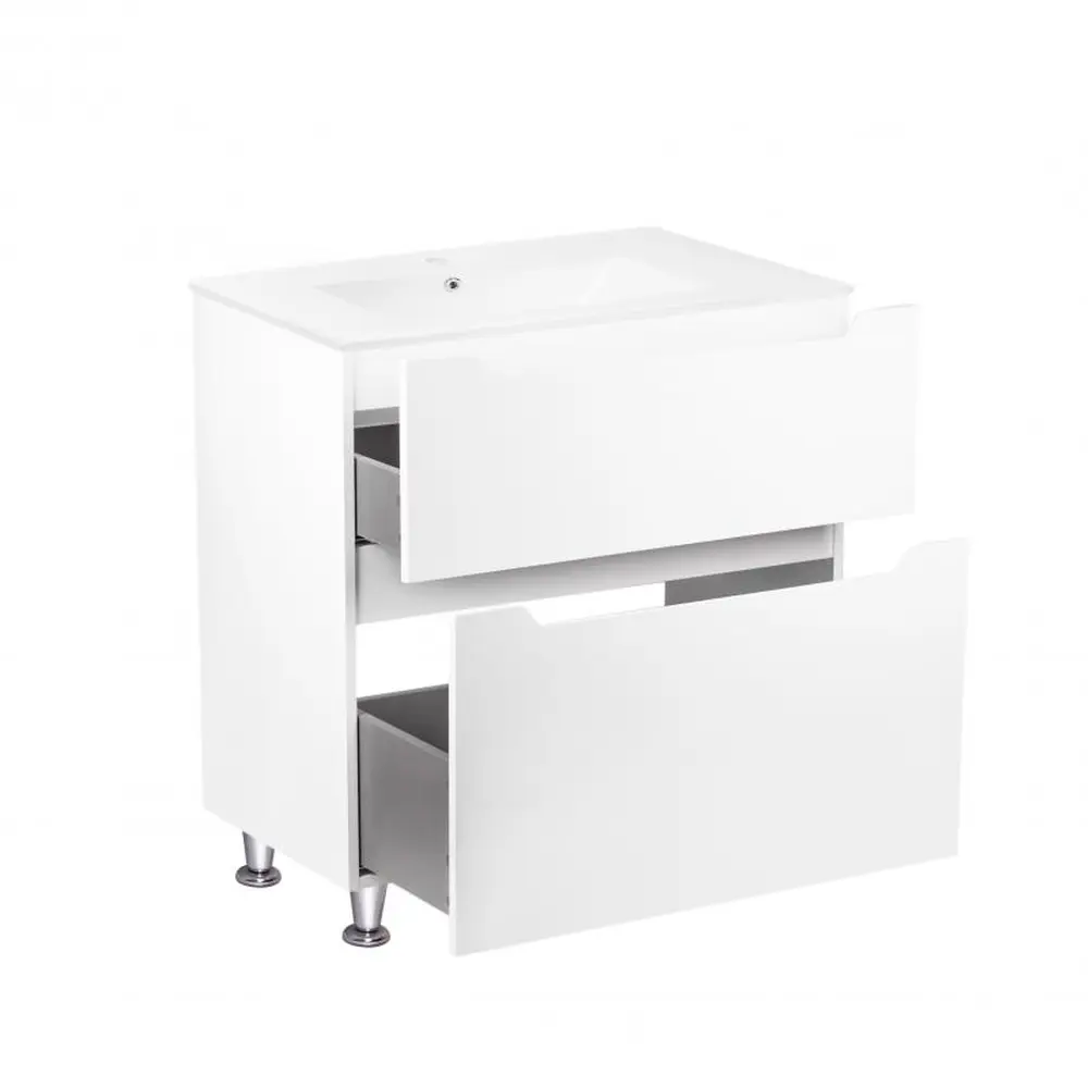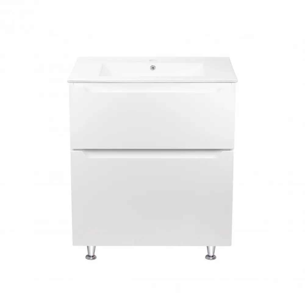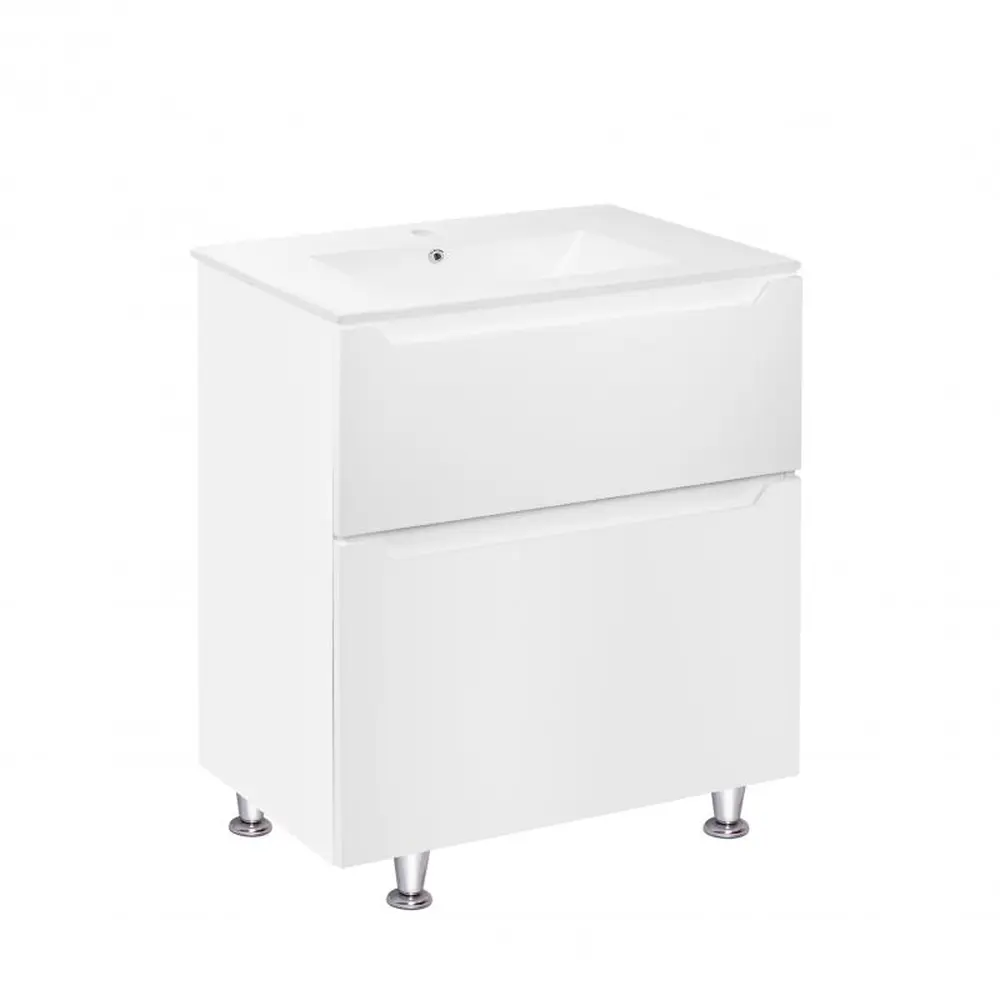Підлогова тумба з раковиною Qtap Scorpio QT1471TNВ7013070CW виконана з отвором під сифон і переливом. У комплекті чотири хромовані металеві ніжки. Корпус тумби білого кольору виготовлений з ЛДСП, фасадна частина - з МДФ з глянцевим покриттям. Виріб оснащений двома висувними ящиками з механізмом доводчика. Тумба виконана в елегантному лаконічному стилі, який впишеться в дизайн будь-якої ванної кімнати.