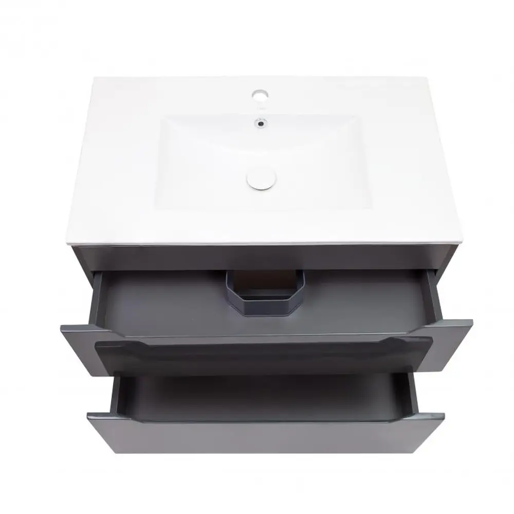 Підвісна тумба з раковиною Qtap Scorpio QT1472TPВ8013080CW виконана в лаконічному стилі, який доповнить дизайн будь-якої ванної кімнати. Раковина виготовлена з якісної кераміки білого кольору, вона виконана з отвором під сифон і переливом. Корпус тумби сірого кольору виготовлений з ЛДСП, фасадна частина - з МДФ з глянцевим покриттям. Оснащена двома висувними ящиками з механізмом доведення.