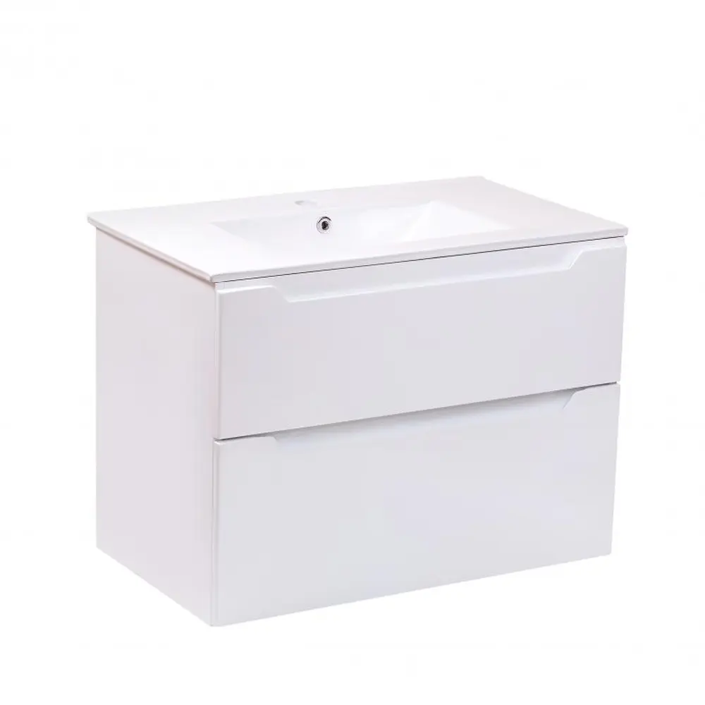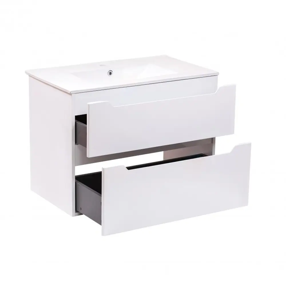 Підвісна тумба з раковиною Qtap Scorpio QT1472TPВ8013080CW виконана в лаконічному стилі, який доповнить дизайн будь-якої ванної кімнати. Раковина виготовлена з якісної кераміки білого кольору, вона виконана з отвором під сифон і переливом. Корпус тумби білого кольору виготовлений з ЛДСП, фасадна частина - з МДФ з глянцевим покриттям. Оснащена двома висувними ящиками з механізмом доведення.