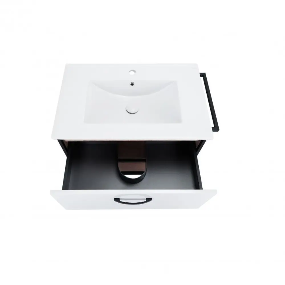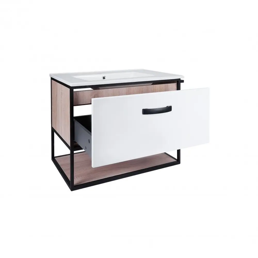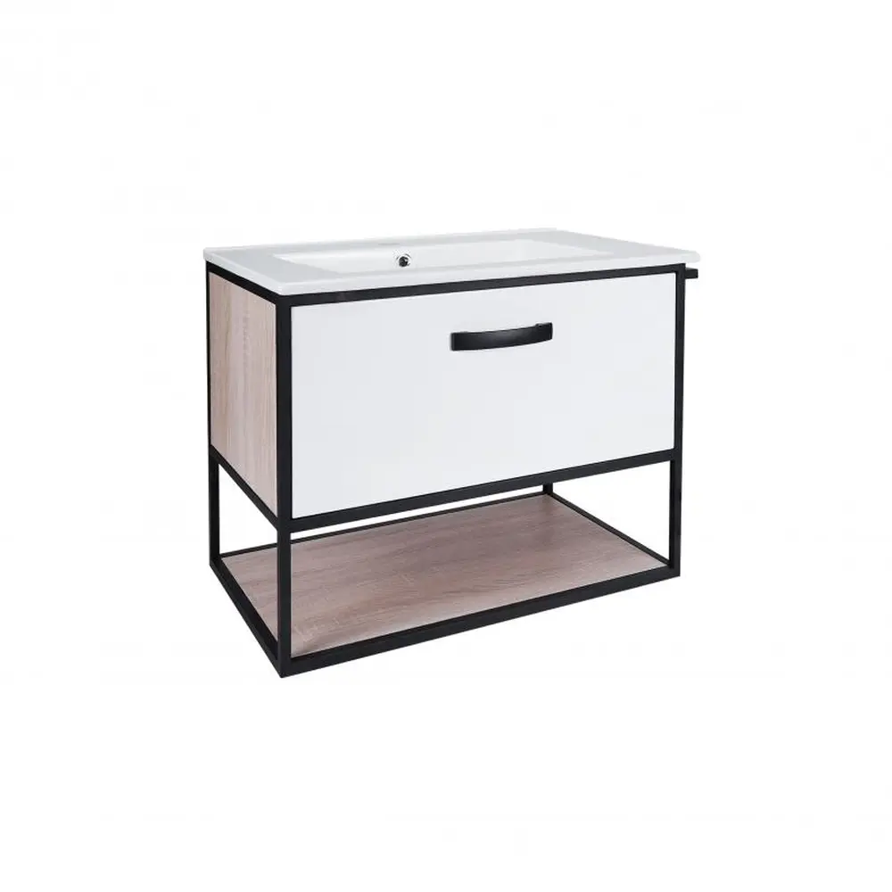 Тумба, раковина, донний клапан, кріпильні деталі. Металічний каркас, ручки та тримач для рушників виготовлені зі сталі.