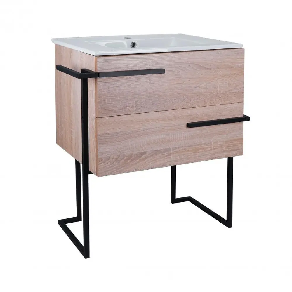 Тумба, раковина, донний клапан, кріпильні деталі. Металічний каркас, ручки та тримач для рушників виготовлені зі сталі.