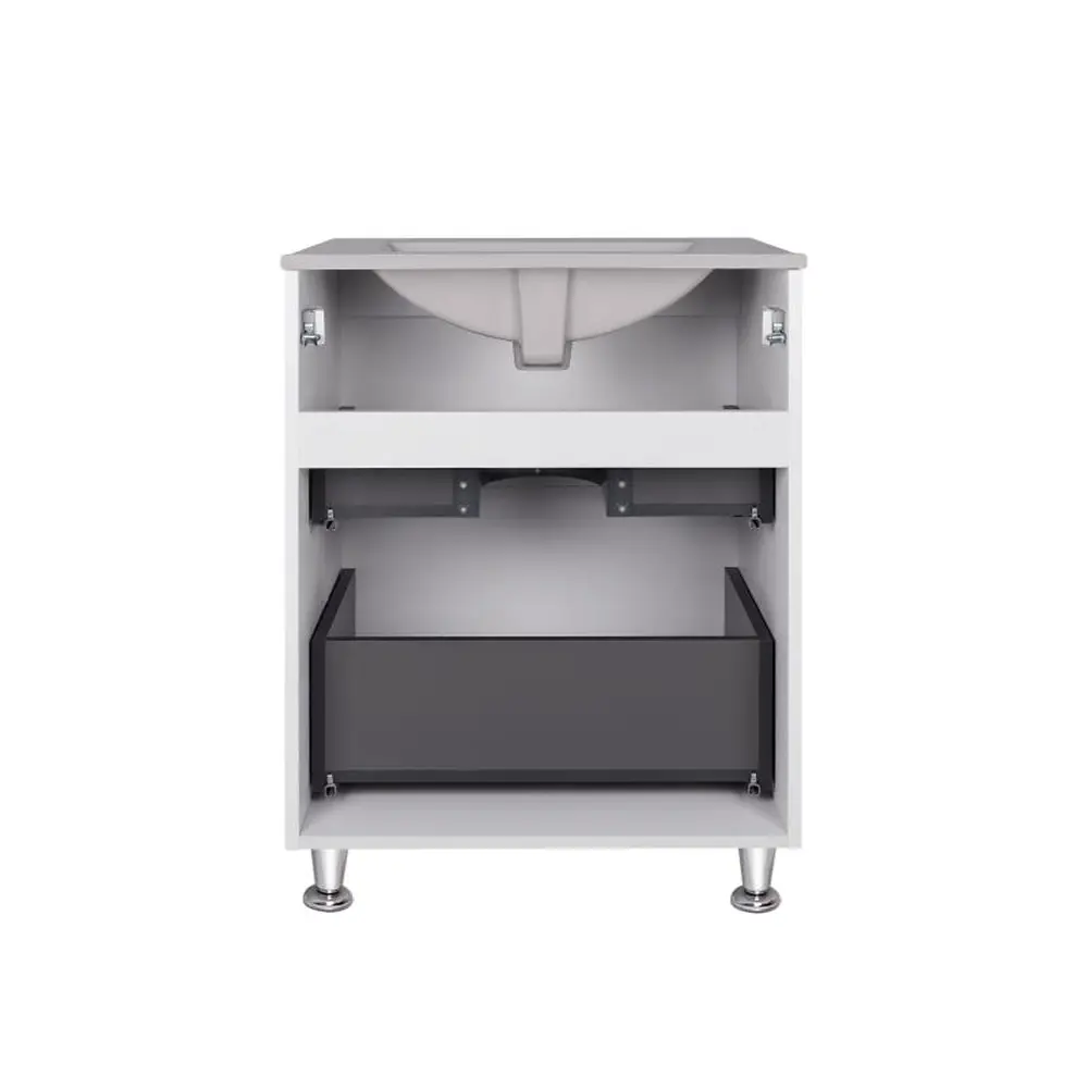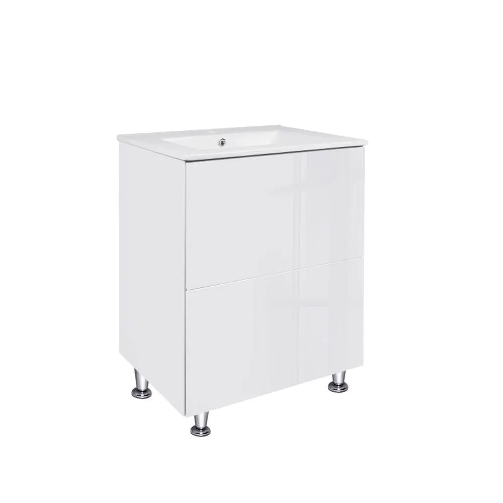 Комплект Qtap Tern 600х725х437 White тумба підлогова + раковина урізна QT1771TNL6013060CW виконаний в лаконічному стилі, що доповнить дизайн будь-якої ванної кімнати. Раковина виготовлена із якісної кераміки білого кольору, вона виконана з отвором під сифон та переливом. Корпус тумби білого кольору виготовлений із ЛДСП, фасадна частина із МДФ із глянцевим покриттям. Також тумба оснащена сучасною зручною системою відкривання ящиків push-to-open. У комплекті чотири стійкі металеві ніжки.