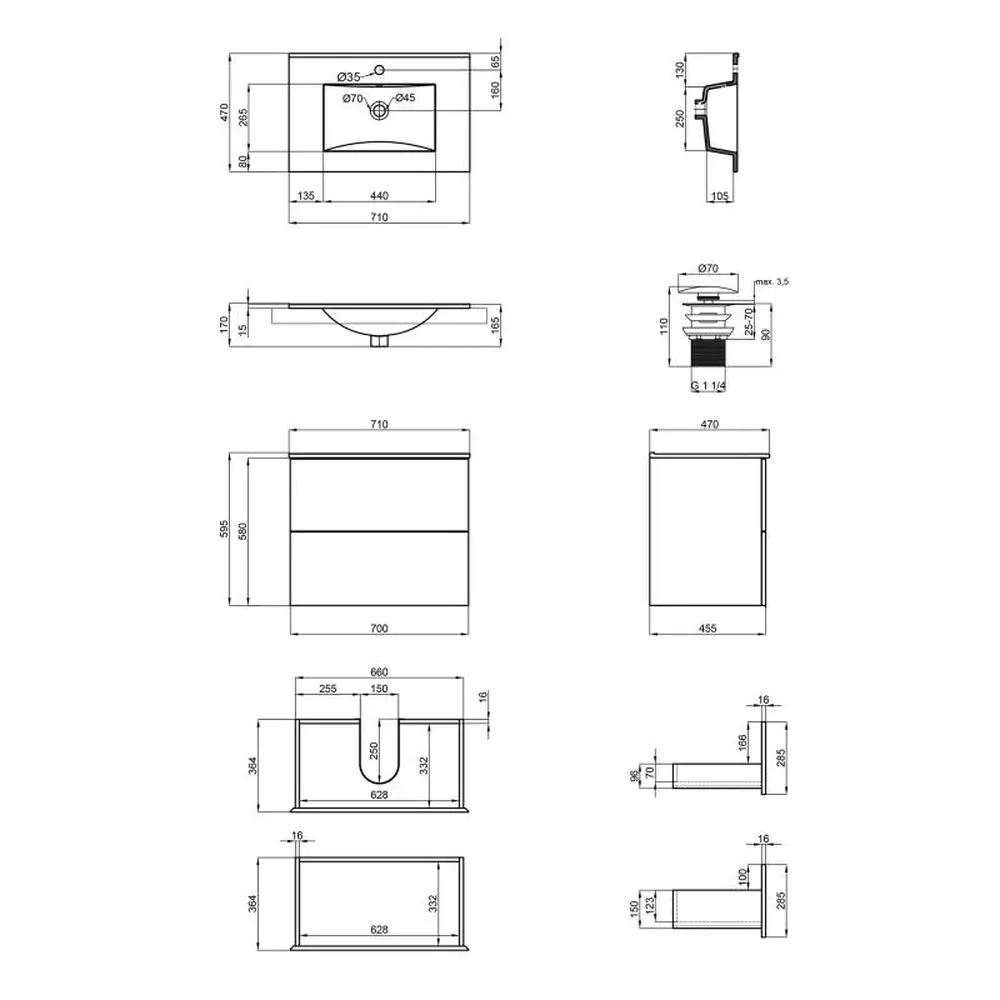 Тумба, раковина, донний клапан, кріпильні деталі. Тримач для рушників купується окремо.