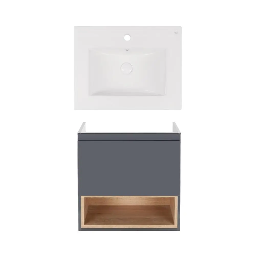 Підвісна тумба Qtap Robin QT1374TPВ6002GWO виконана з отвором під сифон. Корпус тумби сірого кольору виготовлений з ЛДСП, фасадна частина - з МДФ з глянцевим покриттям. Виріб оснащений зручним і містким висувним ящиком з механізмом доводчика, а також стильною полицею кольору білого дуба. Раковина Qtap Albatross New QT0111750660W виготовлена з якісної кераміки білого кольору. У комплектацію входить донний клапан для перекриття зливного отвору за потреби.